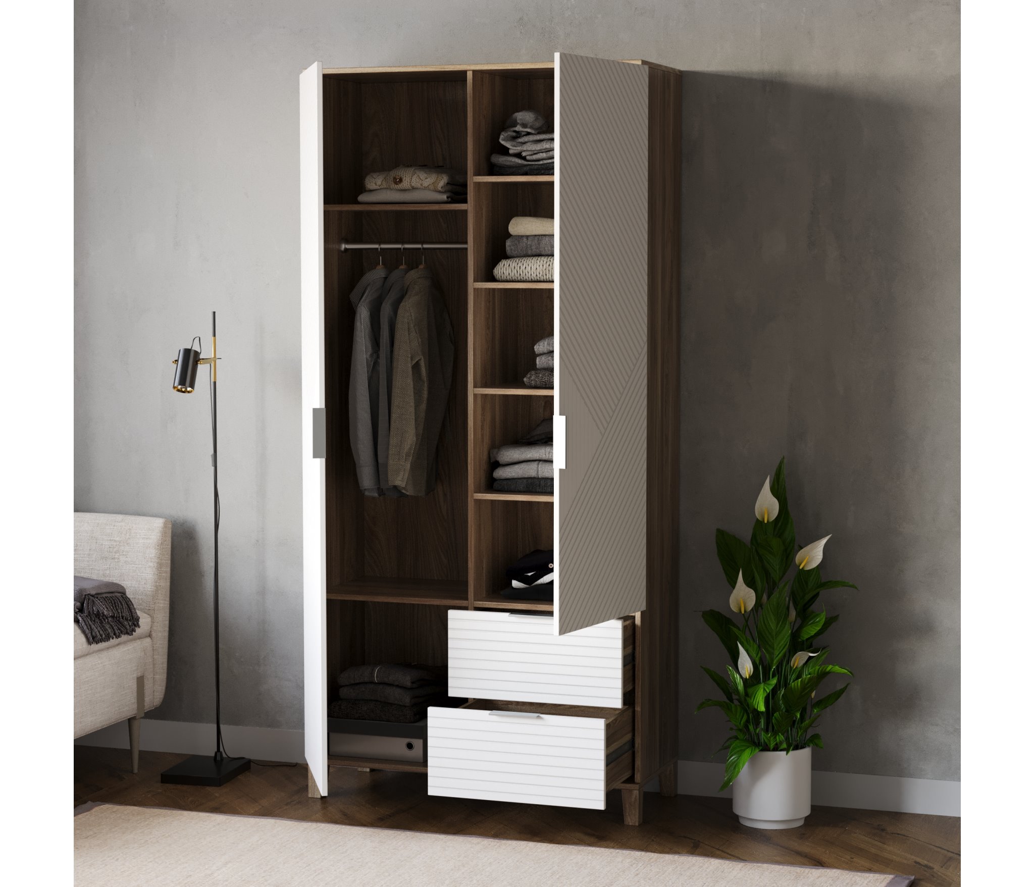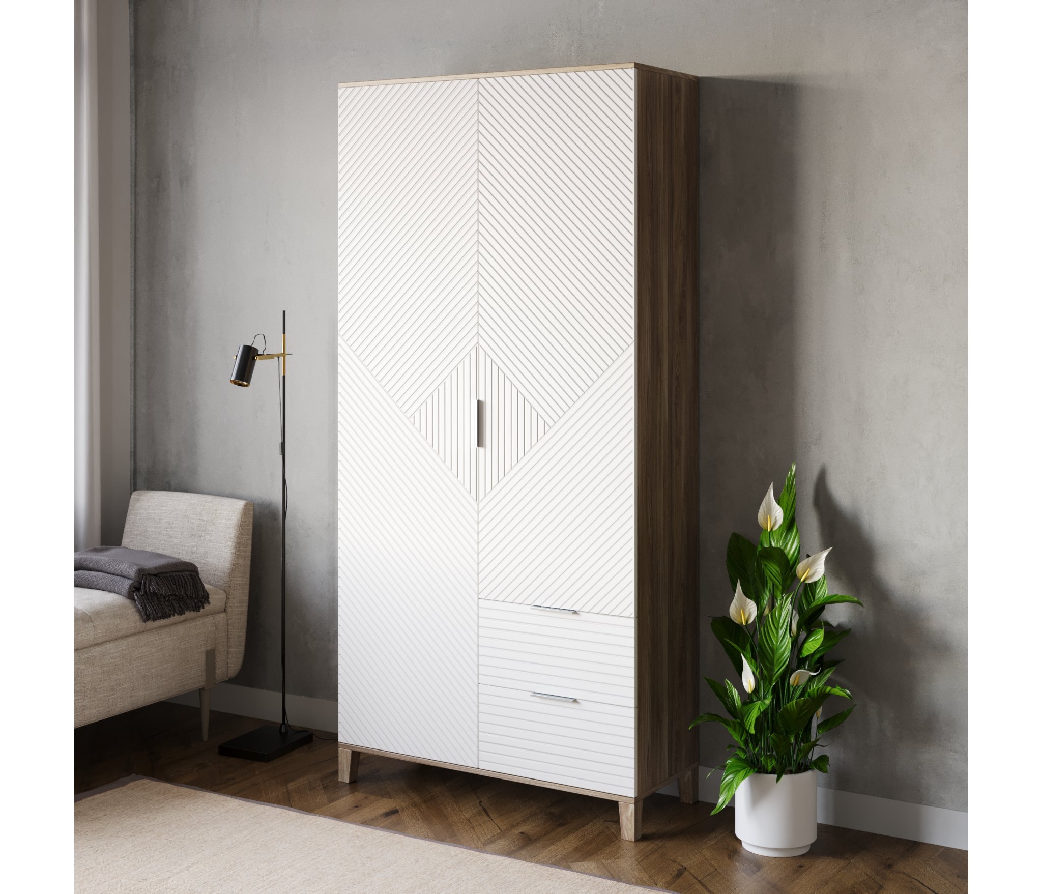 Шкафы Марвин, выполненные в скандинавском стиле, органично дополнят интерьер любой комнаты. Ножки из массива бука, геометрическая фрезеровка на фасадах, сочетание цветов отличительная черта серии Шкафов Марвин.