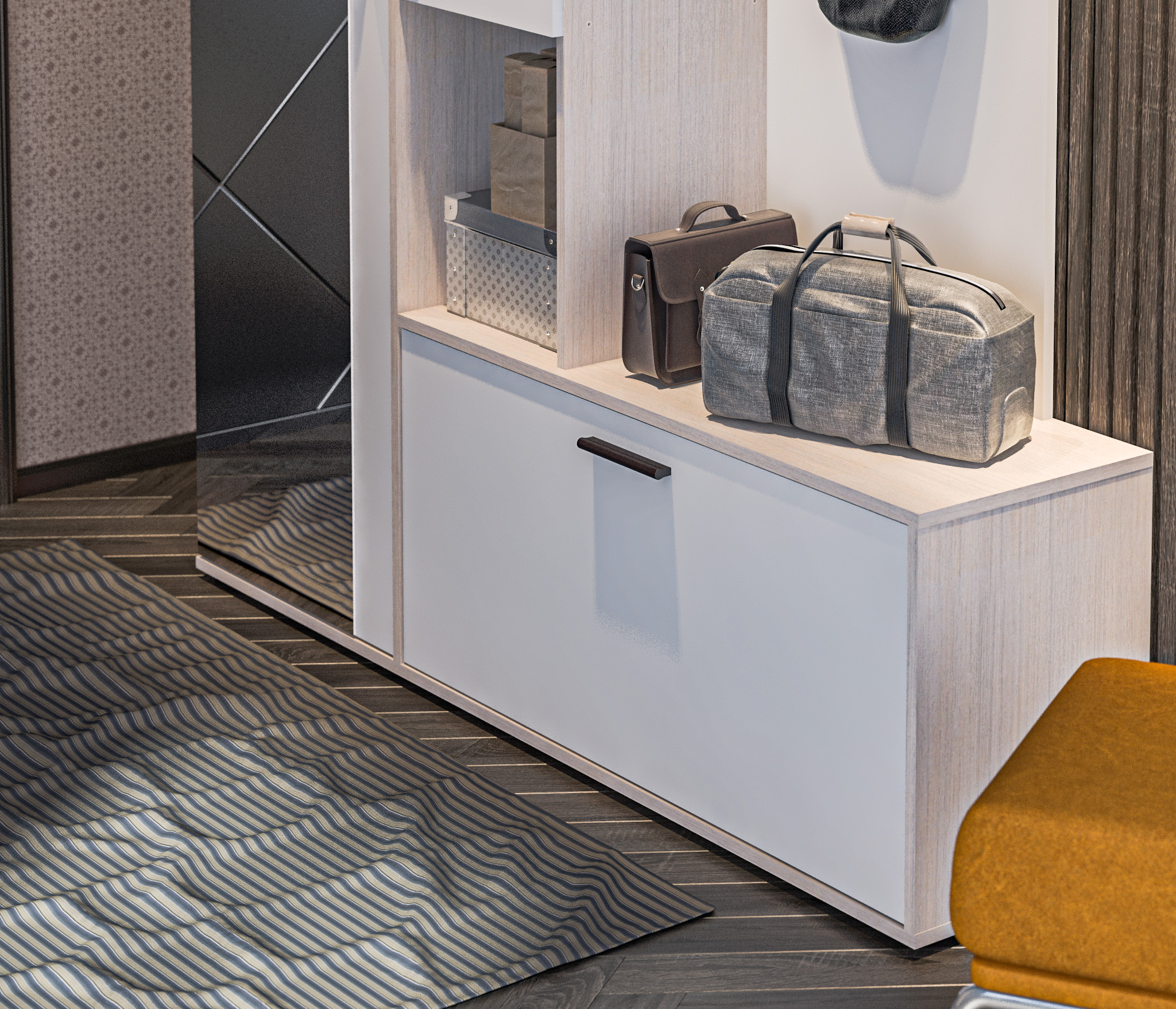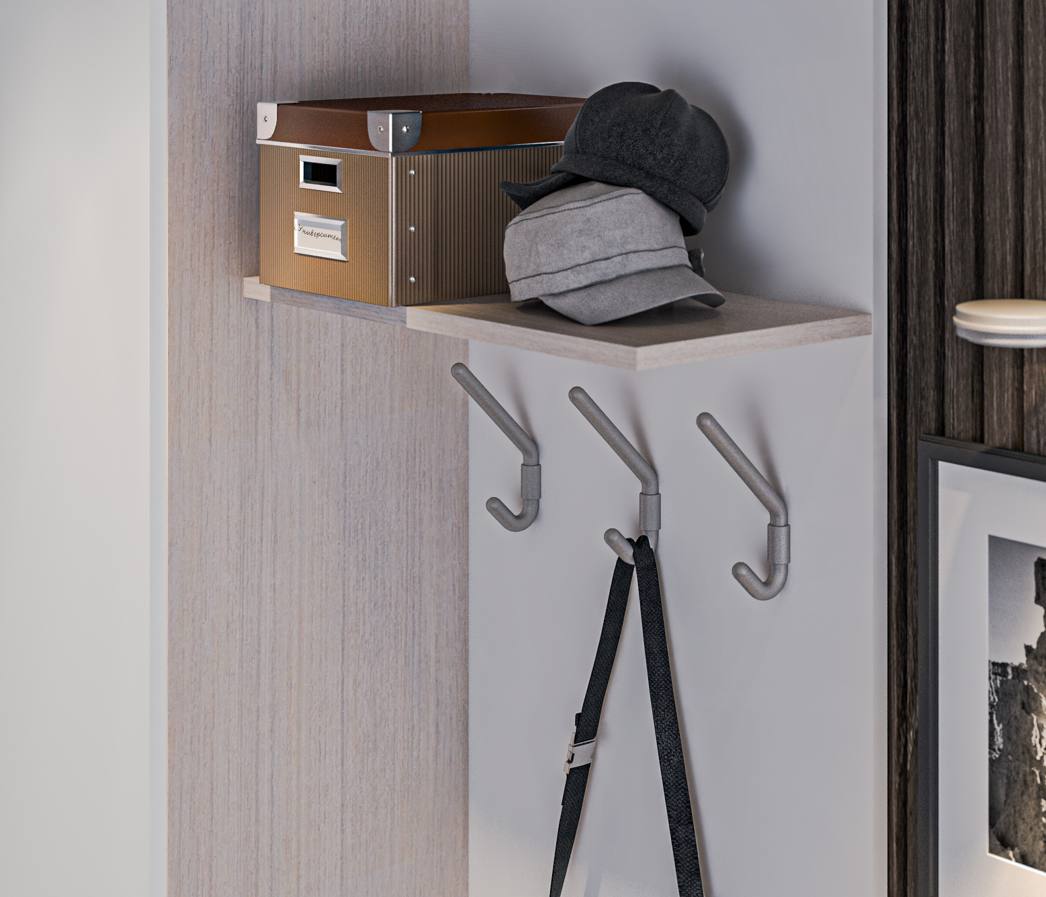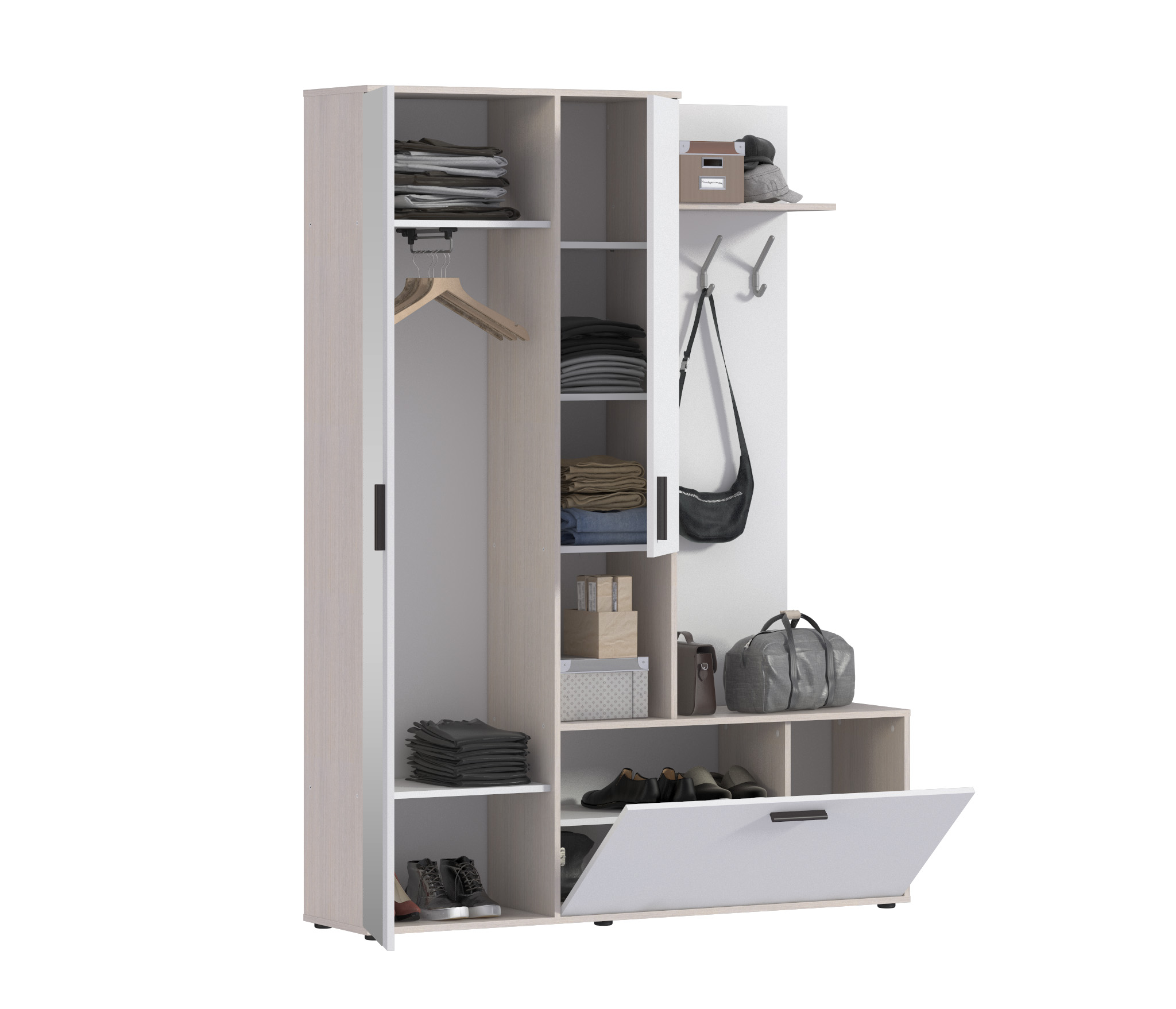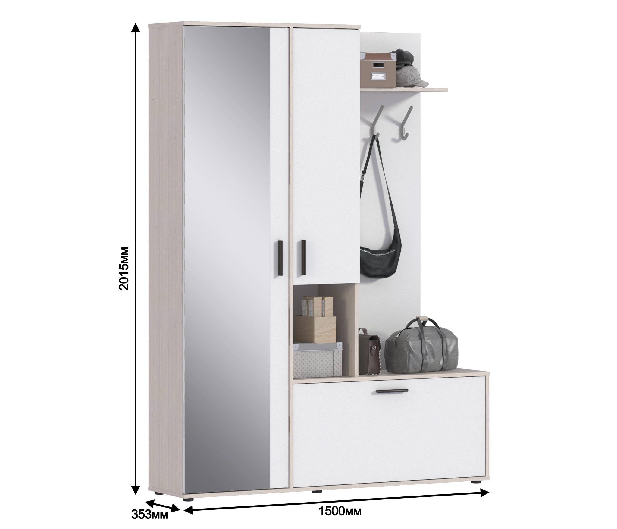 Внутри располагается выдвижная штанга для одежды и две полки (сверху и снизу).