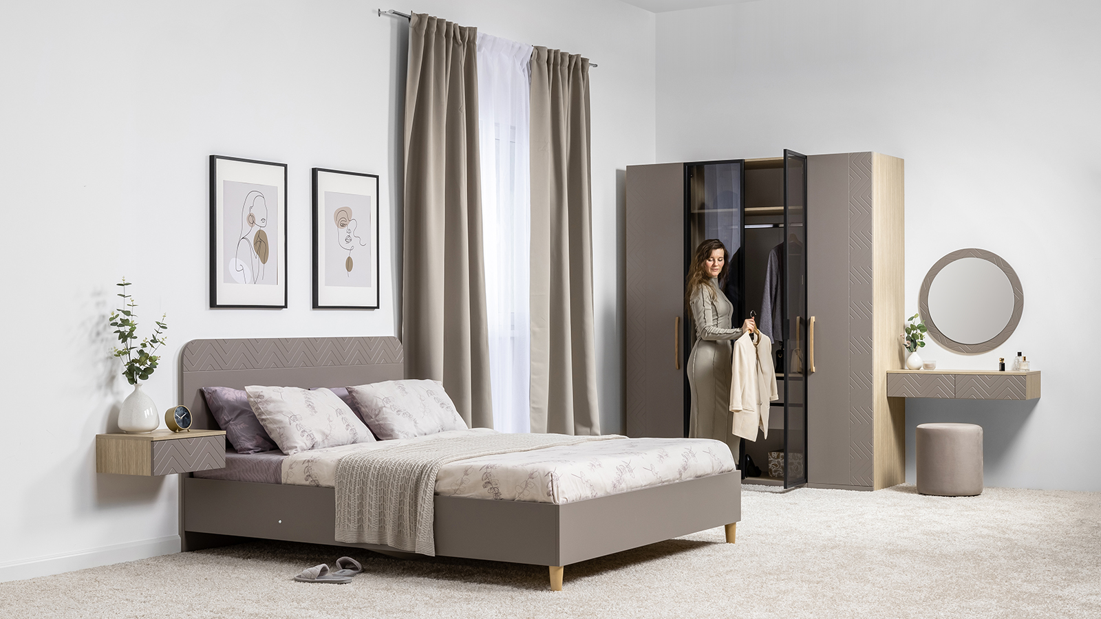 Подвесные консоли и велюровый пуф в тон фасадов дополняют сдержанный и благородный облик спальни Амьен.