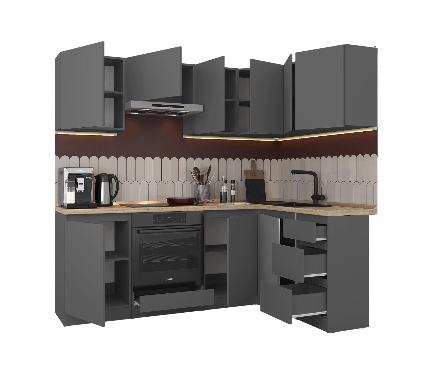 Обратите внимание, что столешница, стеновая панель, мойка и смеситель не входят в комплектацию кухни Леон и приобретаются отдельно. Это позволяет вам выбрать идеальные аксессуары и элементы для создания индивидуального дизайна вашей кухни.