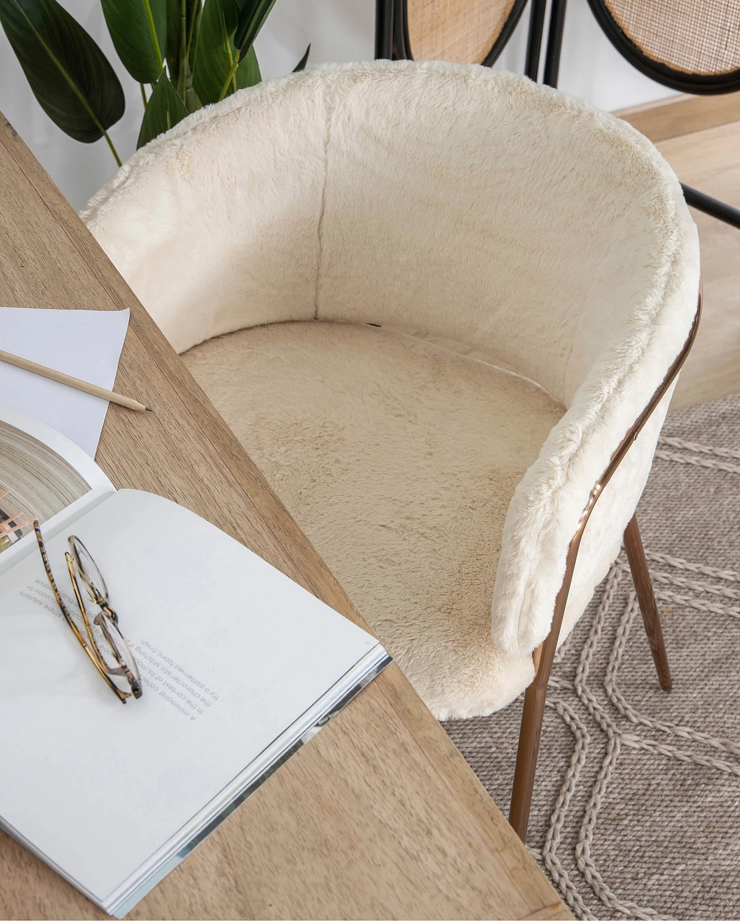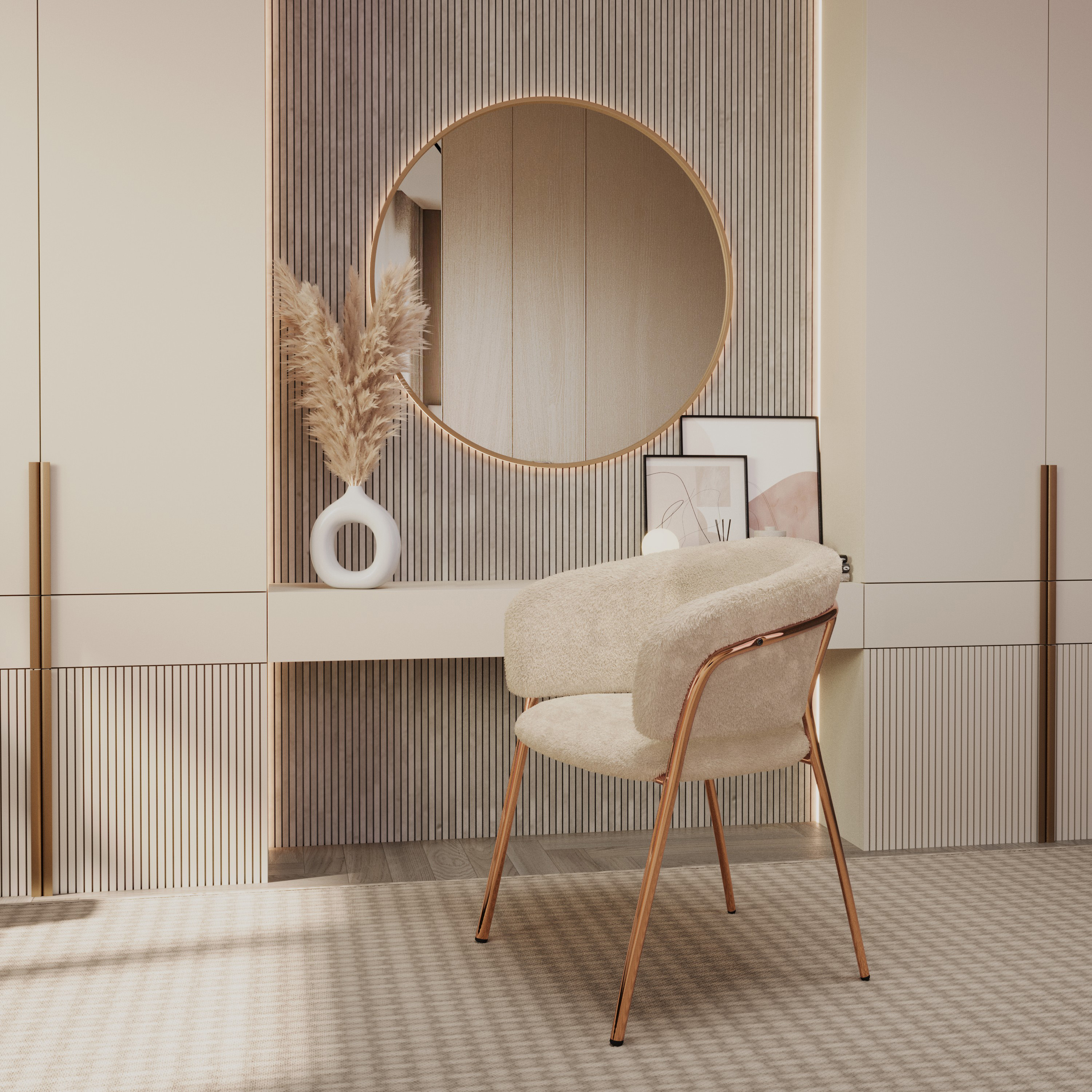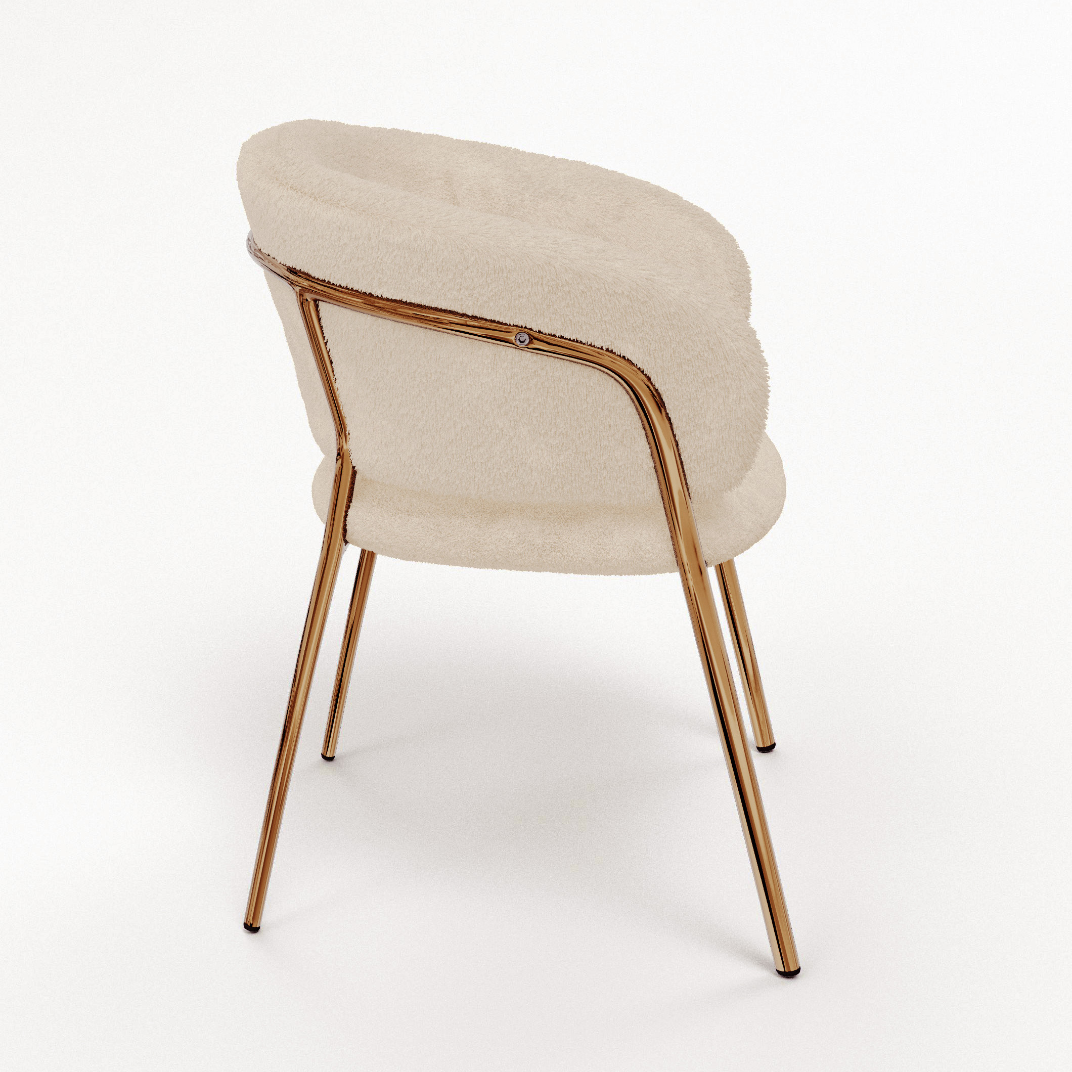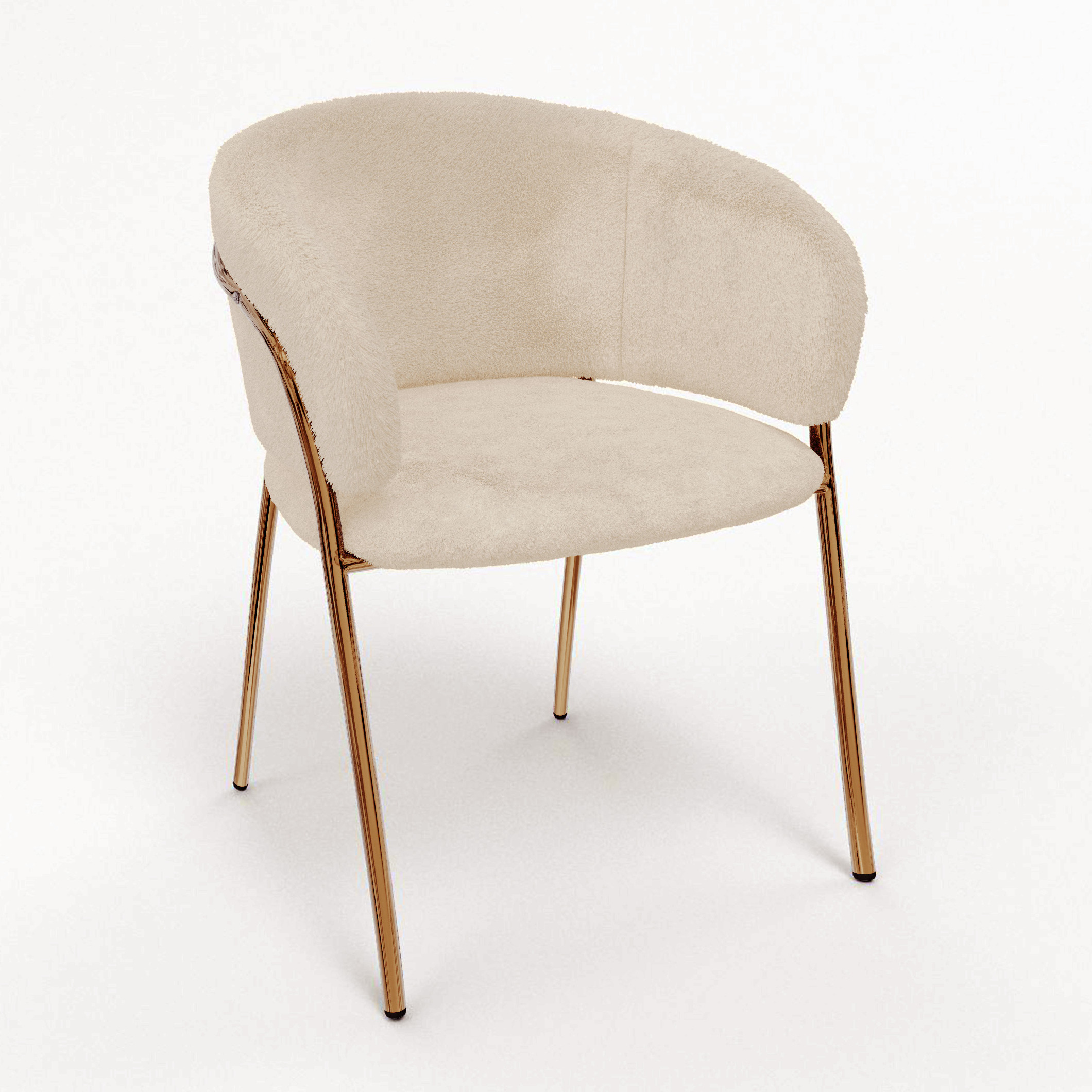 Кресло выполнено в бежевом цвете с золотистыми акцентами, что придает ему изысканный и современный вид. Плюшевая обивка, обеспечивает мягкость и комфорт при использовании.