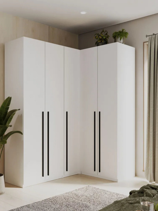 Представляем угловой шкаф для одежды распашной с ящиками, идеально подходящий для современного интерьера. Этот стильный белый шкаф станет не только функциональным, но и эстетичным дополнением вашей комнаты, благодаря своему изящному дизайну. Он прекрасно впишется в прихожую, спальню, детскую или гостиную, обеспечивая достаточное пространство для хранения одежды.