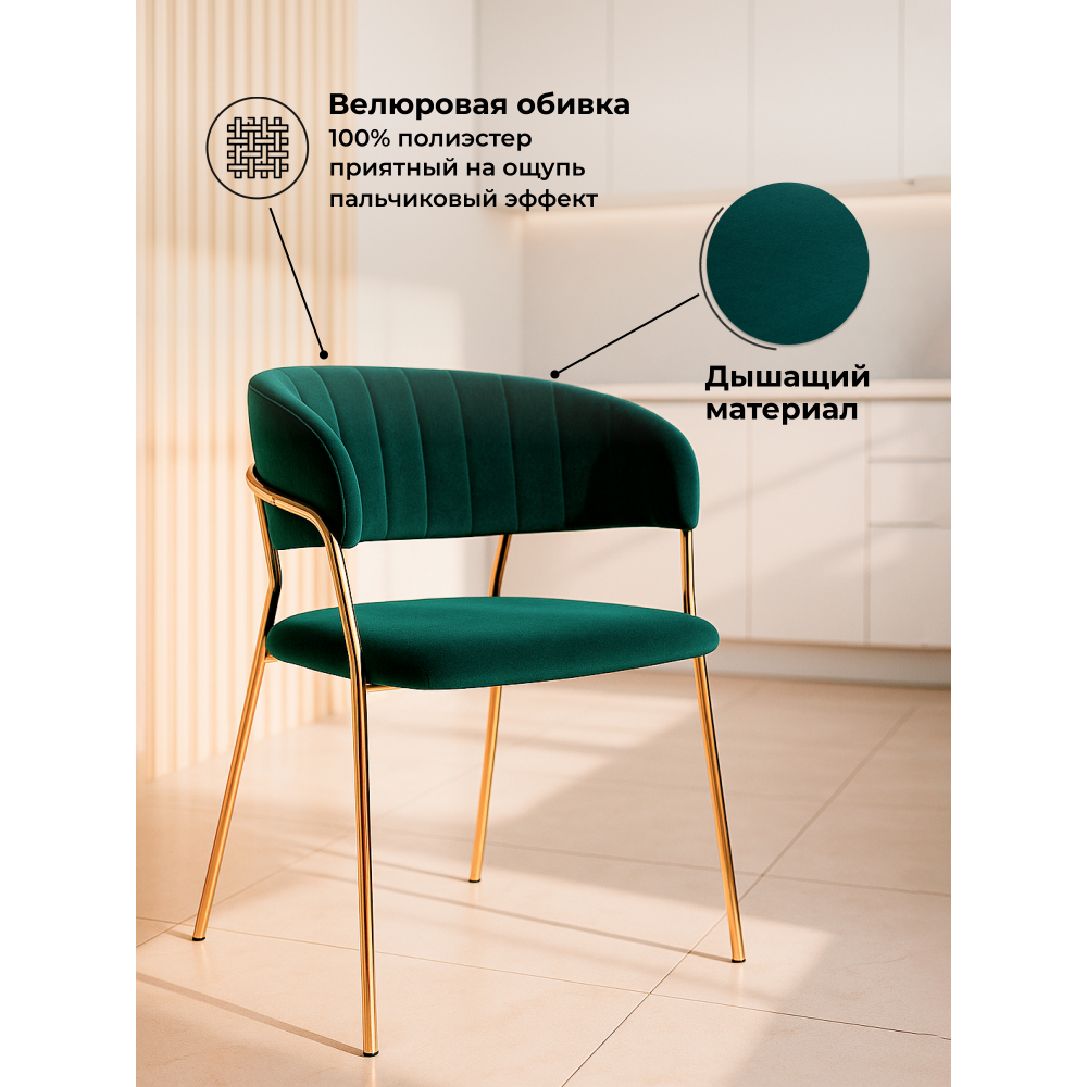 Высота подлокотников: 77 см. Материал каркаса - Металл; Материал сиденья - Велюр; Материал ножек - Металл; Материал обивки - Велюр; Цвет каркаса - Золотой; Цвет ножек - Золотой; Ширина - 57; Глубина - 54; Высота - 83; Ширина сиденья - 49; Глубина сиденья - 47; Высота сиденья - 46.