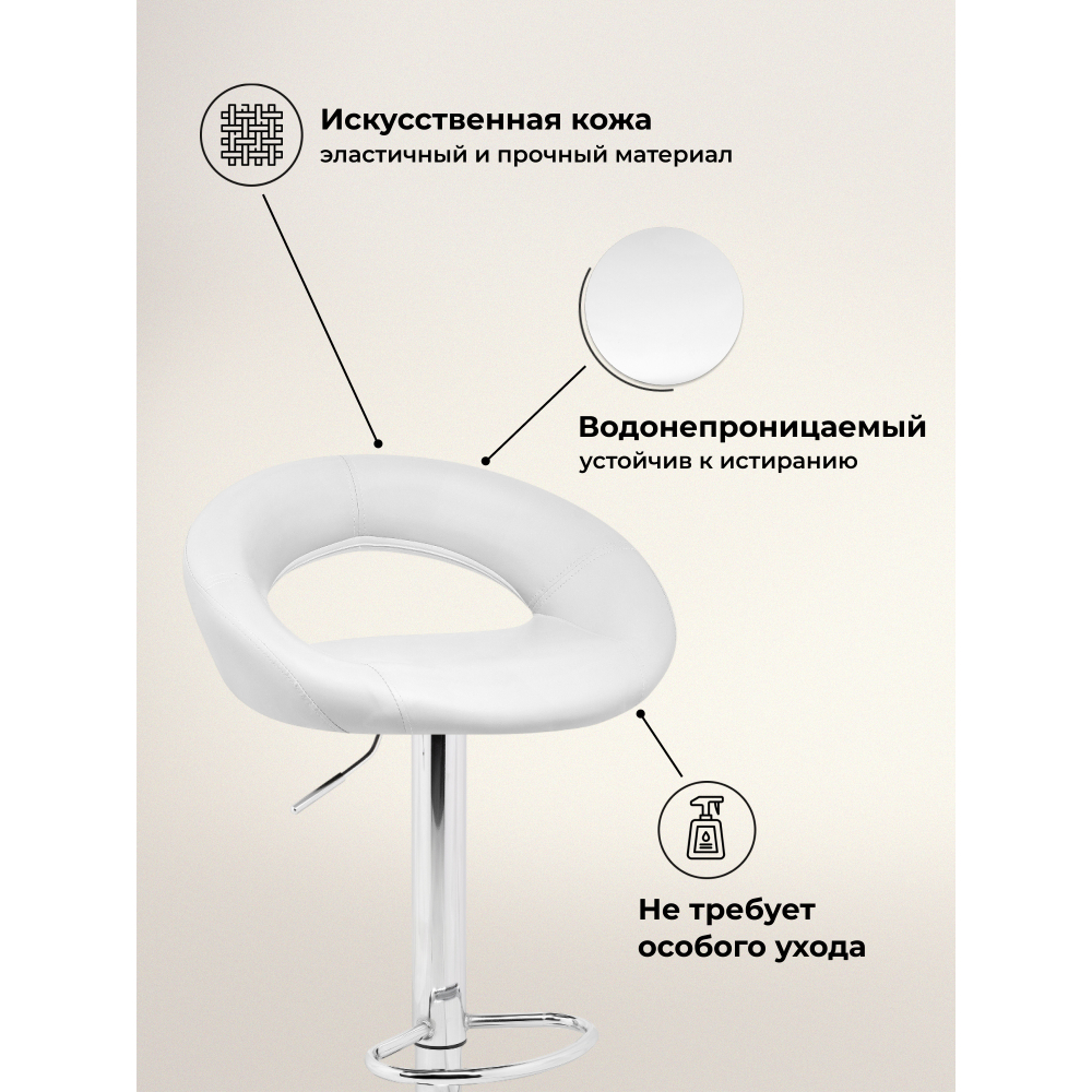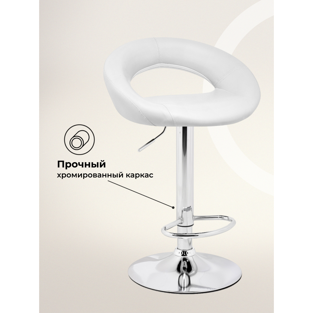 Внимание! Барный стул поставляется без декоративного кольца у основания. Материал каркаса - Хромированный металл; Материал обивки - Кожзаменитель или велюр; Цвет ножек - Хромированный металл каркас; Ширина - 51; Глубина - 46; Высота - 80; Глубина сиденья - 36; Высота сиденья - 59; Высота сиденья максимальная - 80,5; Высота максимальная - 101,5.