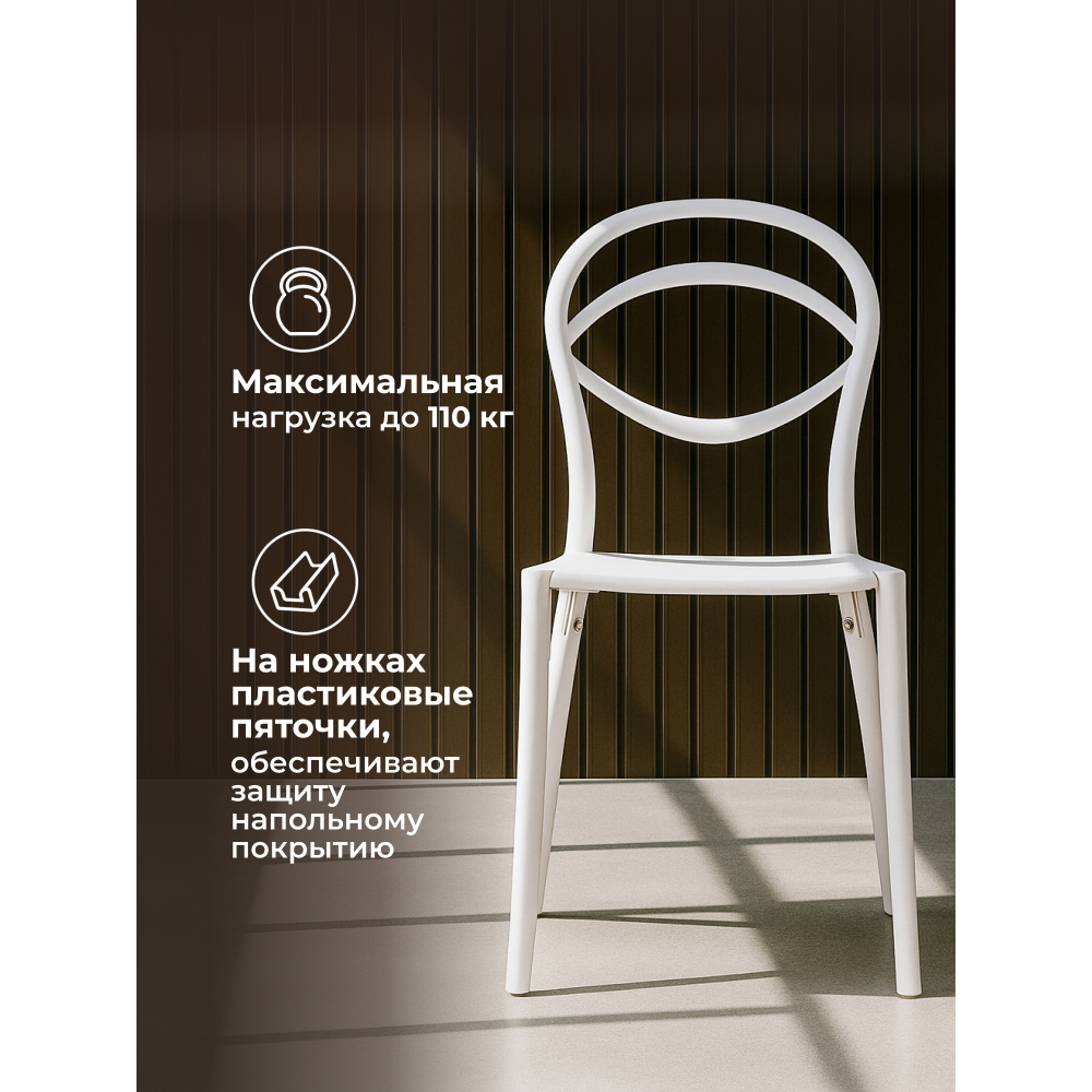 Пластиковый стул Simple выполнен из прочного пластика. Не требует специального ухода, легко моется. Максимальная нагрузка: до 110 кг. На ножках есть пластиковые пяточки, обеспечивающие защиту покрытию