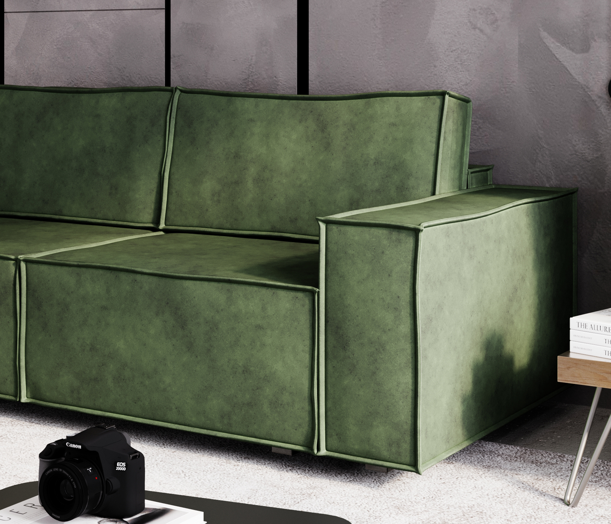 Диван выполнен из однотонного велюра без «пальчикового» эффекта.Antistratching effect позволяет ткани не вытягиваться и долго сохранять первоначальный вид.