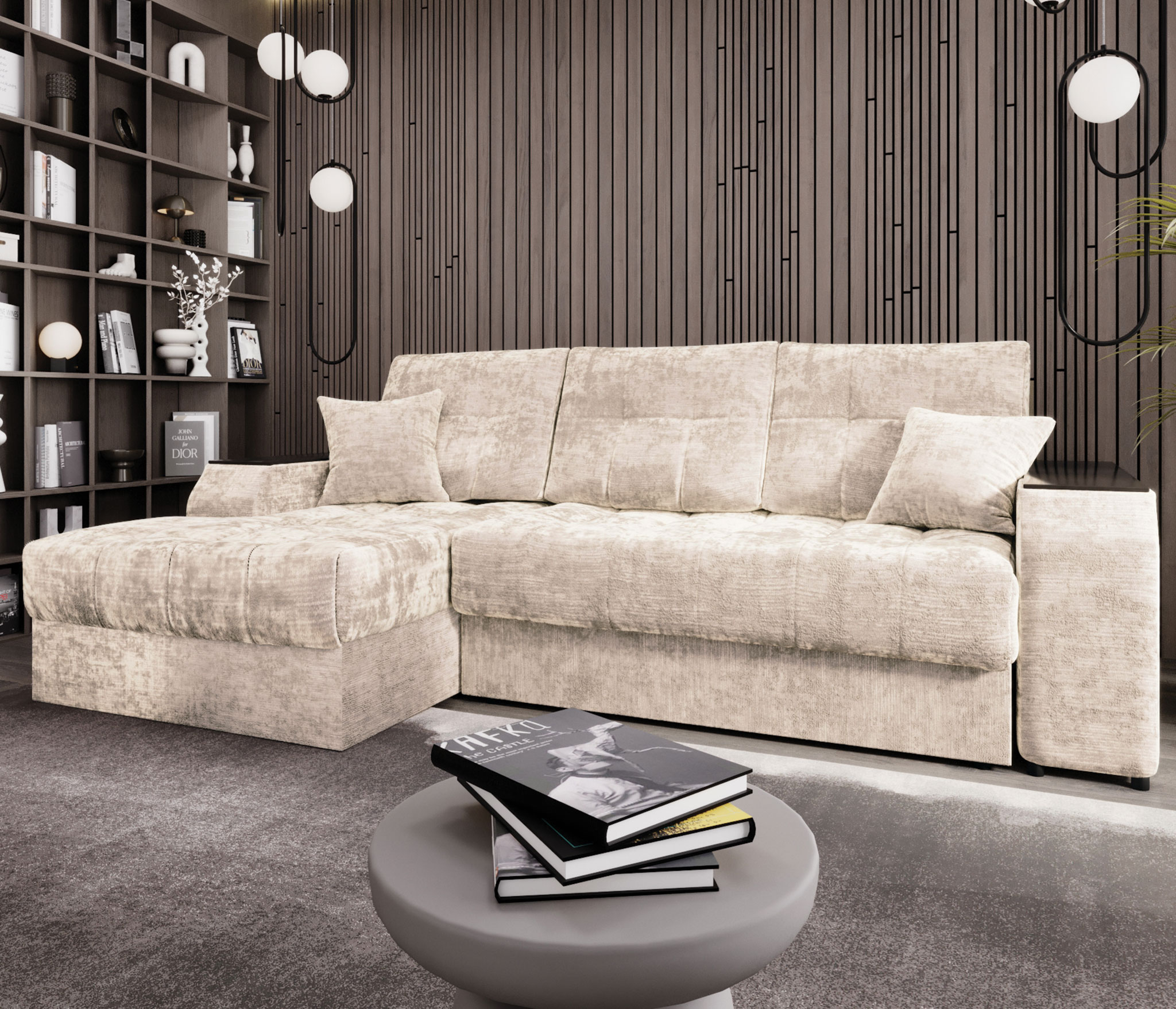 Оттоманка имеет оригинальную Г-образную форму, обтекающую подлокотник спереди. Это придаёт дивану изысканный вид и, когда диван установлен подлокотником к стене, отсутствует щель между оттоманкой и стеной, что удлиняет спальное место. Под декорами в подлокотниках скрыты два вместительных короба. В них можно хранить как постельное бельё, так и множество вещей, которым иногда сложно найти место, например, игрушки и даже инструменты. Мягкие приспинные подушки создают дополнительный комфорт во время сидения.Декоративные подушки при желании можно подложить под спину или голову. Задняя планка придаёт жёсткость конструкции и ограничивает соприкосновение со стеной во время сна.Благодаря утяжкам на сидении дивана ткань не растягивается и не собирается в складки.
