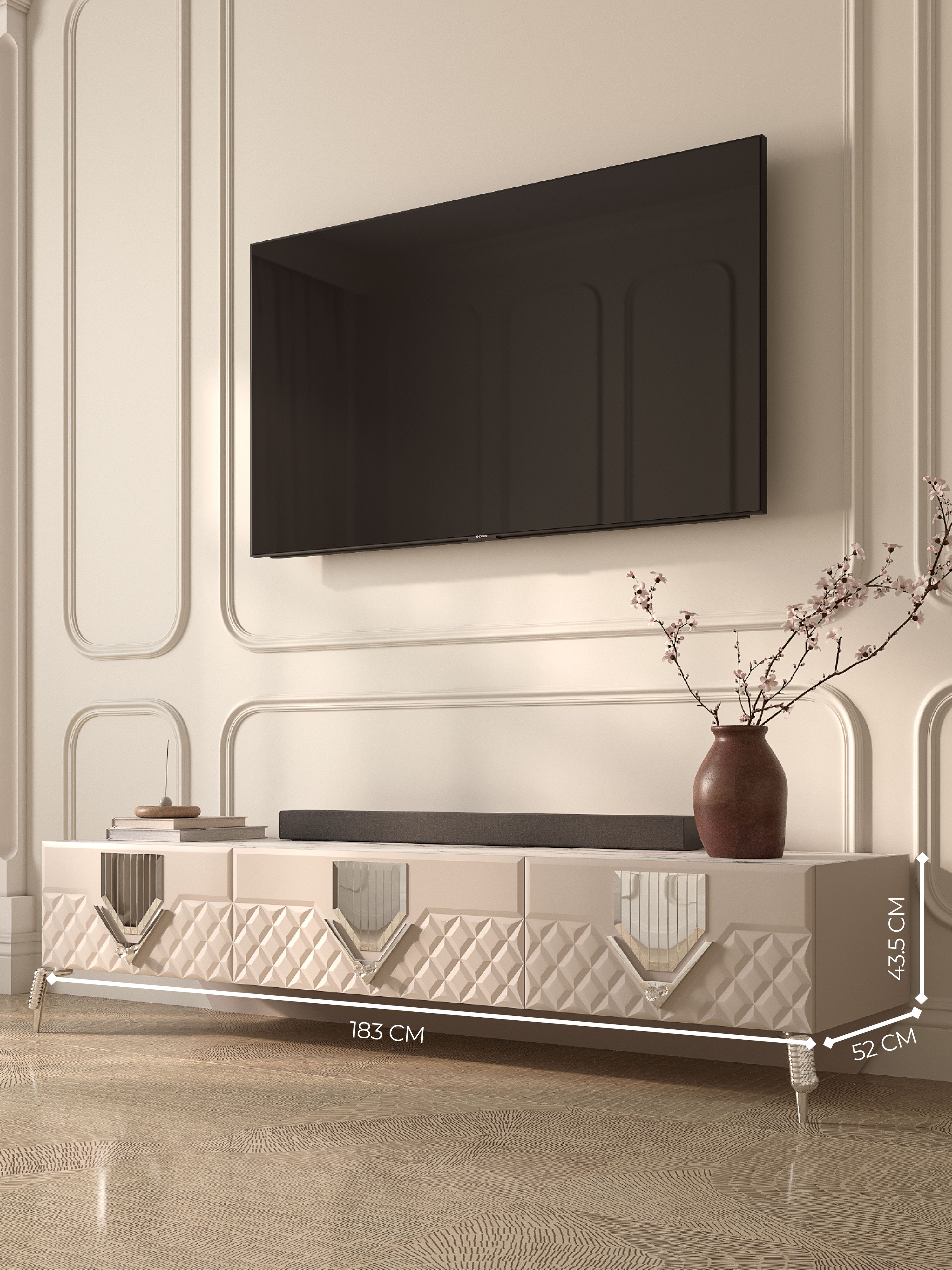 Эта телевизионная тумба оснащена удобными выдвижными ящиками и дверцами для хранения, что делает ее функциональной и практичной. Вы можете разместить внутри различные предметы: книги, технику или другие вещи, которые хотите организовать в квартире или доме. Также предусмотрена полочка для дополнительных аксессуаров, которая идеально подойдет для размещения декора или мелкой электроники.