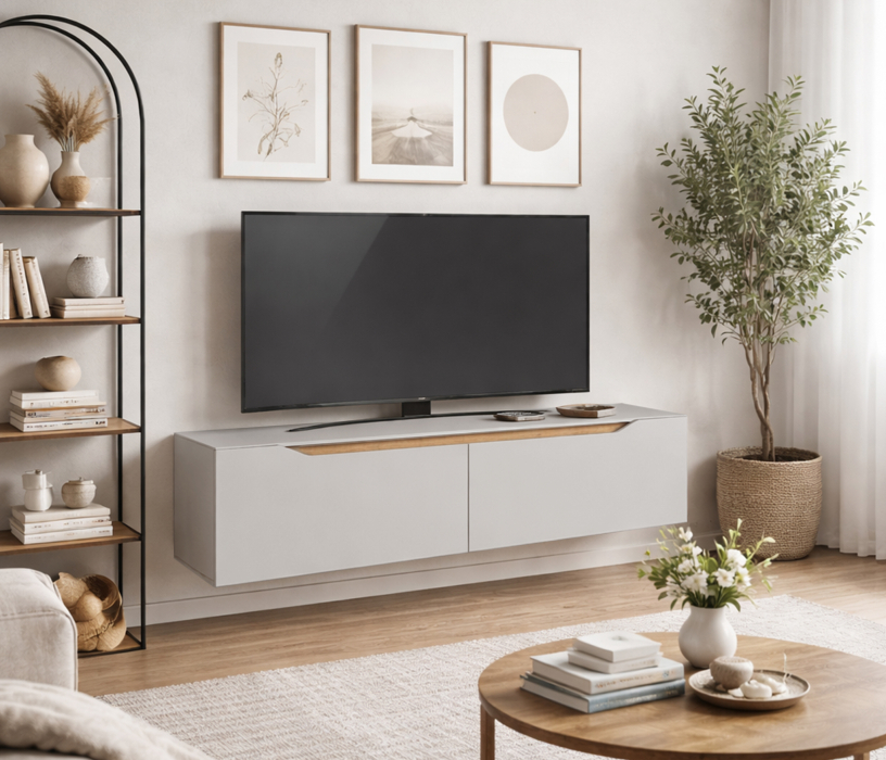 Особенностью данной модели являются плавные вырезы в фасадах, которые не только удобны для открывания, но и добавляют оригинальности. Внутри этих вырезов расположены вставки цвета Дуб вотан, что создает контраст и подчеркивает эстетику мебели.