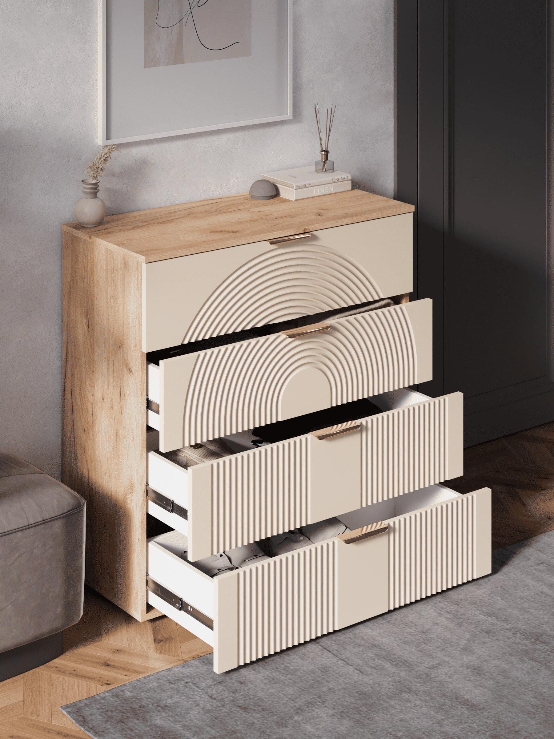 Стильный и практичный комод с ящиками, решит как минимум две ваших задачи, будет служить многофункциональной нишей для хранения вещей, одежды, белья и универсальной подставкой для различных предметов интерьера, а также можно использовать в виде тумбы под телевизор. Наша коллекция Ингрия российского производства выглядят легко и современно, идеально впишется в лофт, скандинавский, современный, минимализм и прочие популярные стили интерьеров. Его минималистичный дизайн придаст легкость и простор всему вашему интерьеру. Комод компактный и сэкономит пространство и организует грамотное хранение вещей. Комод имеет 4 выдвижных ящика. За удобство и комфорт открывания ящиков отвечают шариковые направляющие (без доводчиков), с полным выдвижением. Ящики с такой системой открывания будут ходить практически бесшумно, и выдвигаться полностью, даже при повышенной нагрузке. Ножки изготовлены из прочного массива дерева. Комод изготовлен из материалов высокого качества. За высокопрочность и долговечность отвечает корпус, выполненный из ЛДСП, подходит для активного использования. За эстетику и лаконичность дизайна отвечает фасад из МДФ созданный путем сложной фрезеровки в виде 3D рисунка. Накладные алюминиевые ручки для комода подчеркнут монолитный образ. Комод поставляется в разобранном виде, пусть это вас не пугает. В комплекте предусмотрены все необходимые комплектующие, подробная инструкция и фурнитура. Сборка комода серого с ящиками не потребует особых навыков и не отнимет много времени. Современная мебель для дома должна не только брать на себя пару задач по организации пространства, но и гармонично смотреться, выполняя нужные нам функции. Поэтому комод можно использовать в разных помещениях в гостиной, спальне, прихожей (коридоре), в детской для игрушек, в офисе, в салоне красоты, на балконе. Комод для вещей справится со всеми возложенными на него функциями. Перед отправкой мебели, каждое изделие проходит проверку на наличие брака. Для целостности и сохранности каждого изделия мы разработали усиленную, надежную упаковку. Европейское качество от российского производителя - по доступным ценам.