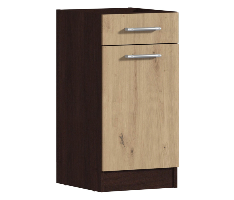 Практичный шкаф для кухни. Его можно использовать и как стол с рабочей поверхностью. У шкафа классический дизайн. В нем есть выдвижной ящик, а в отделении с дверцей — вместительные полки.