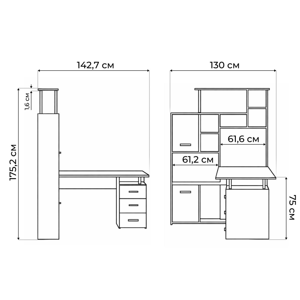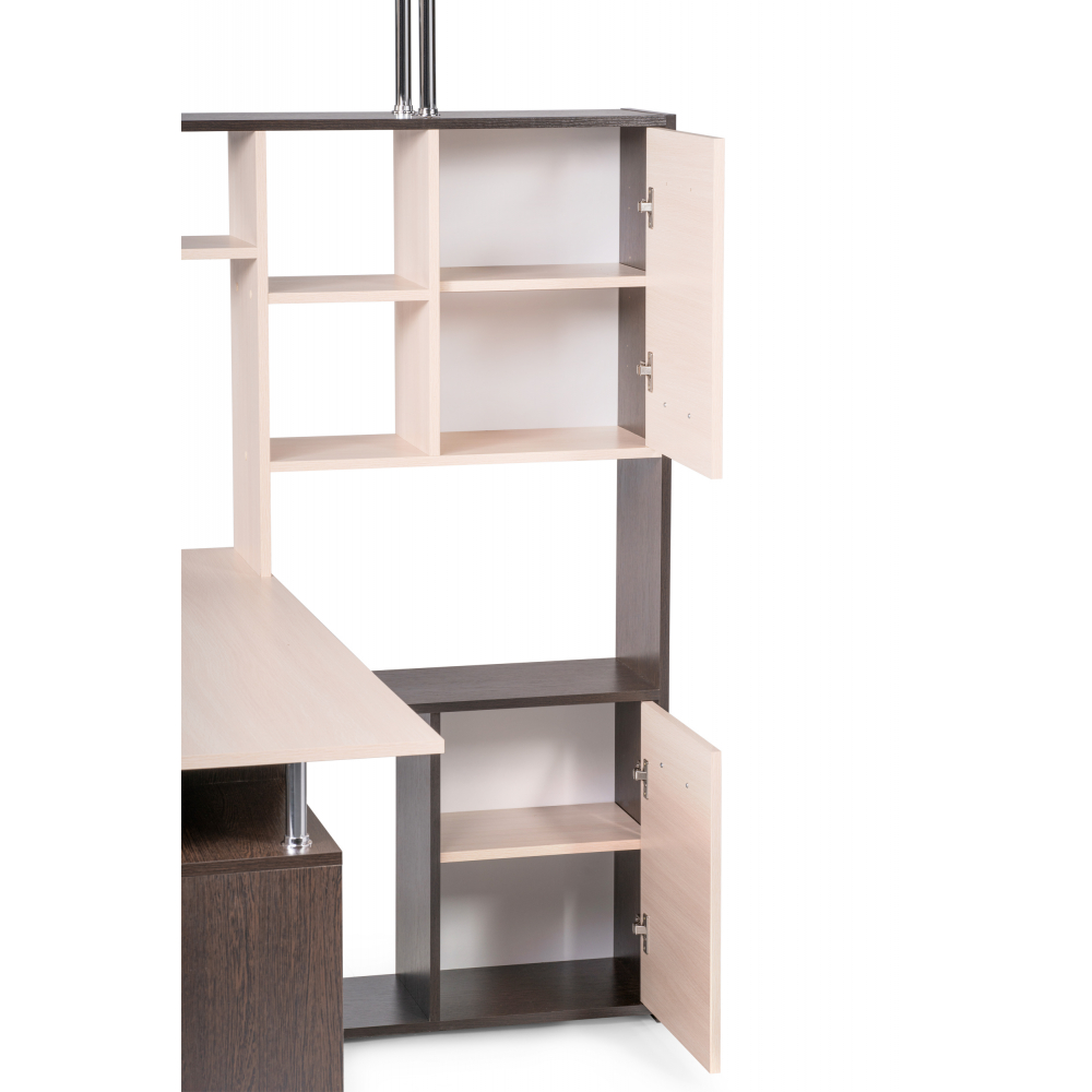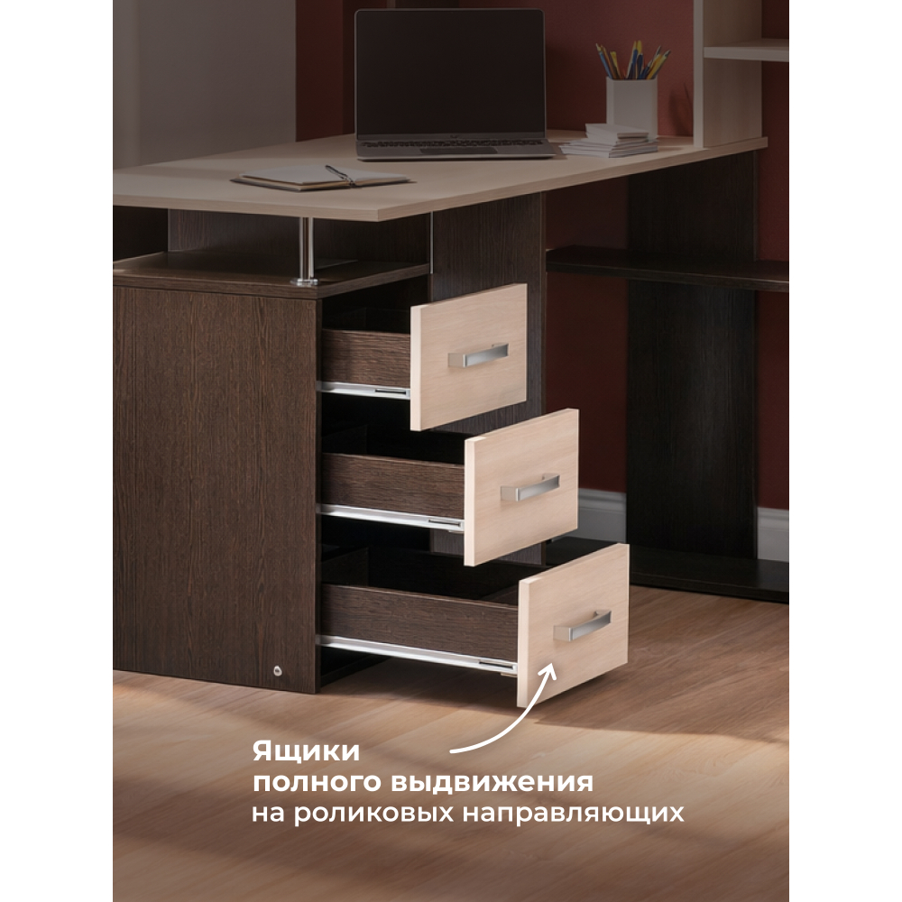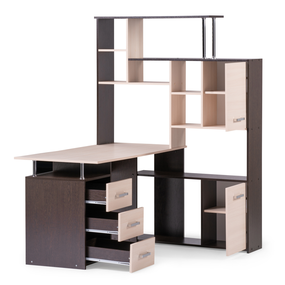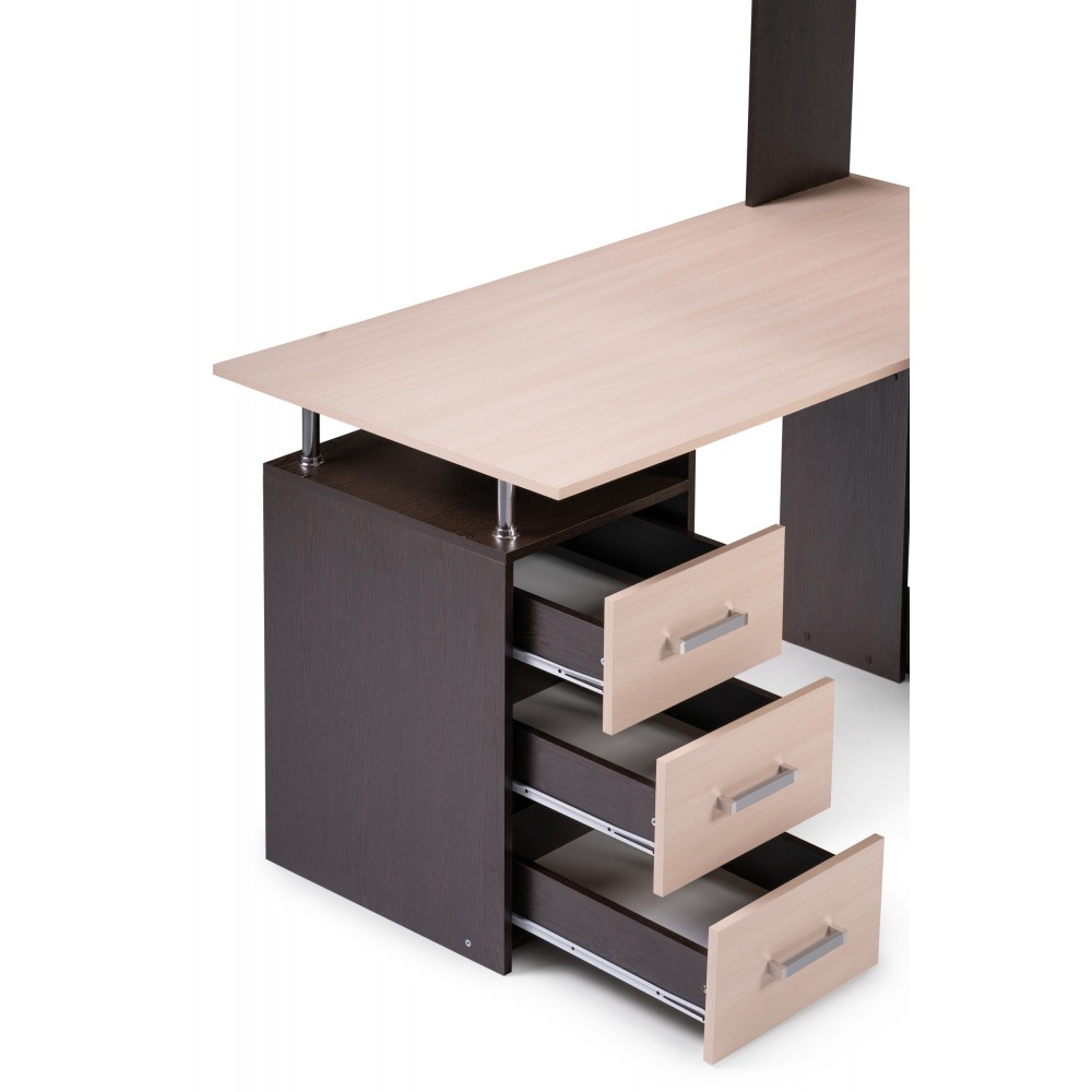 Стол КС-15 венге / дуб молочный правый; ЛДСП. Высота столешницы 75см. Рабочее место - 142х62см. Толщина ЛДСП - 16мм. Имеется 3 выкатных ящика на роликовых направляющих, 4 закрытых дверьми полки. Огромная вместительность для учёбы