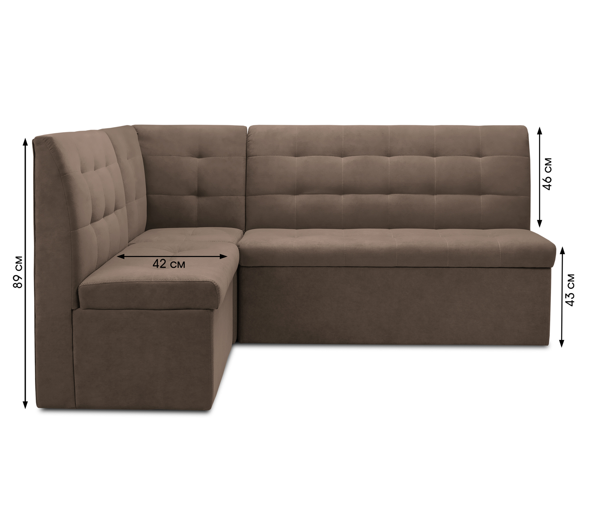 Приобрели уголок для кухни. Очень вместительный. Выбрали в кожзаме черного цвета. Ткань не плохая, даже чем-то похожа на натуральную. Высота от пола 44 см. Сидеть удобно.