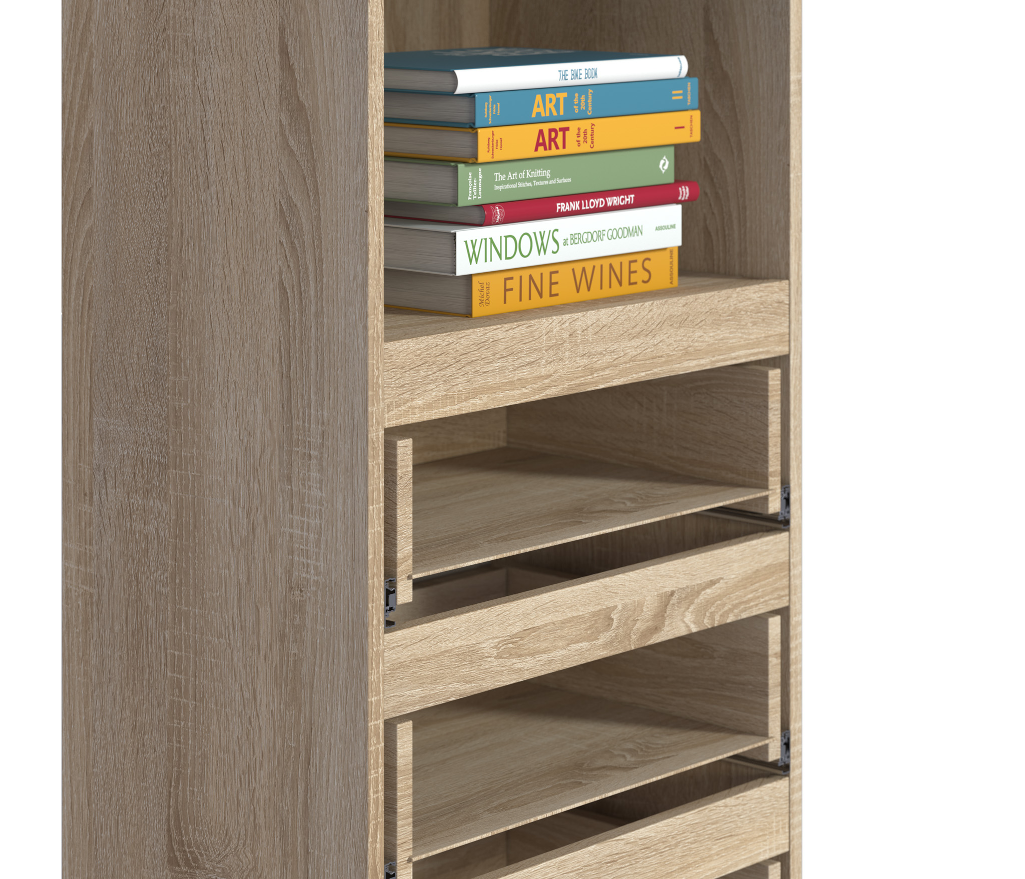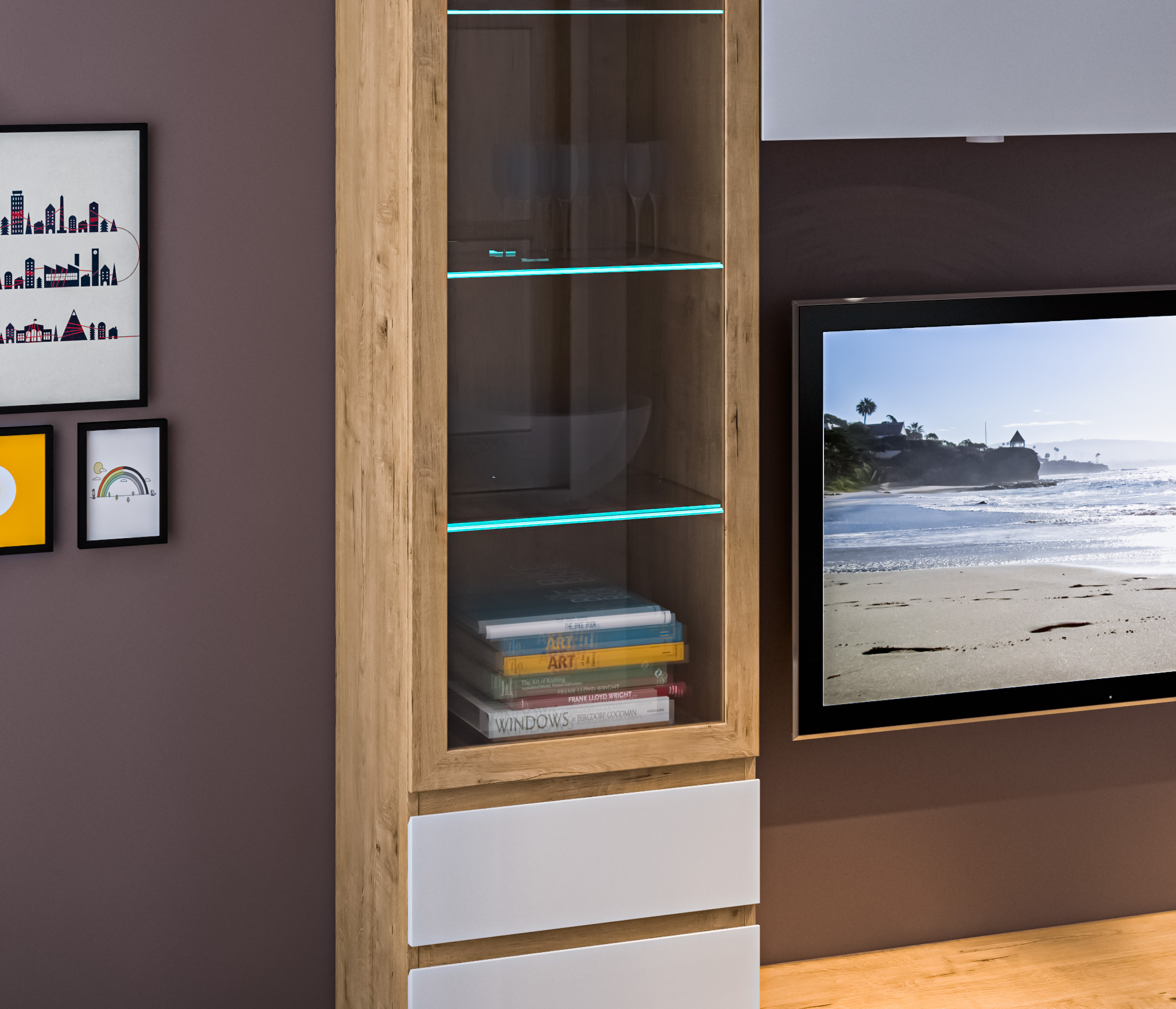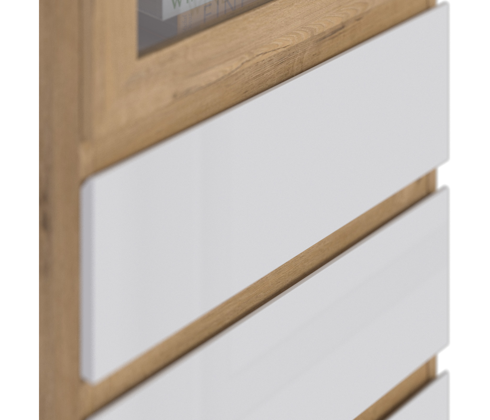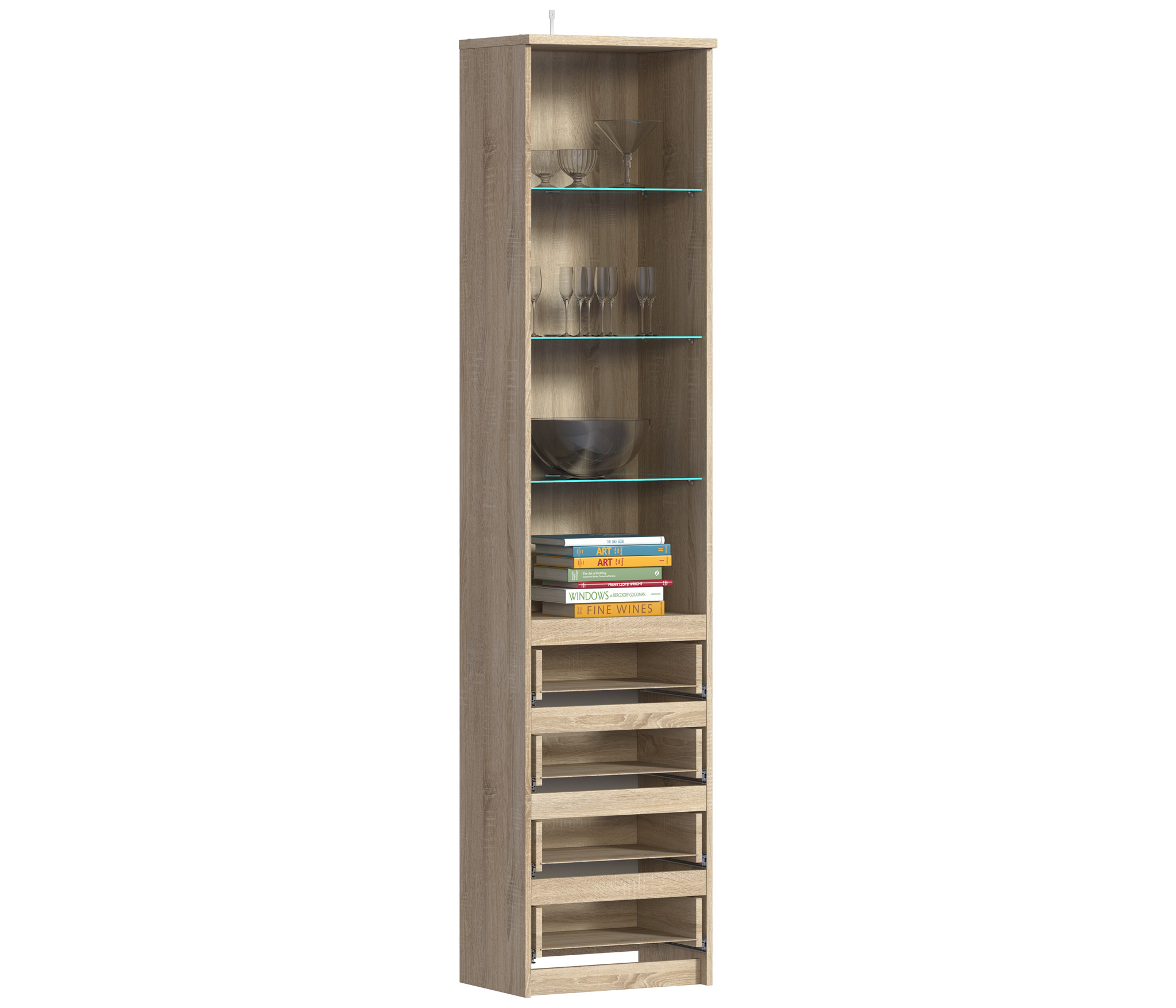 При компактных размерах – ширина 50 см, высота 222 см и глубина 35 см, это довольно вместительная витрина, которая позволит решить вопросы, связанные с хранением памятных вещей. Визуально витрина разделена на два отделения – верхнее – выставочное, находится за прозрачной дверцей и имеет четыре полки. Нижнее включает четыре вместительных выдвижных ящика.
