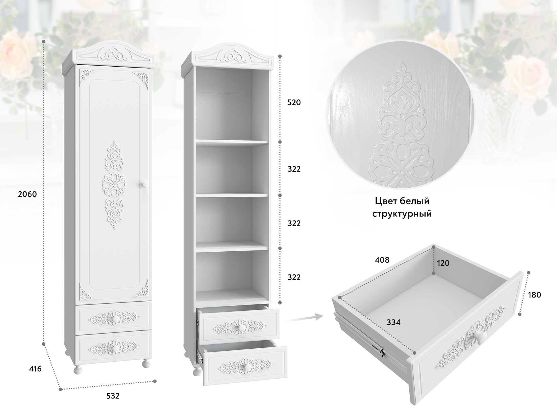 «Ассоль» - мягкий мерцающий глянец и эксклюзивный узор, повторяющийся на фасадах всех модулей идеален для создания нежного уютного интерьера спальни, гостиной, детской, прихожей.