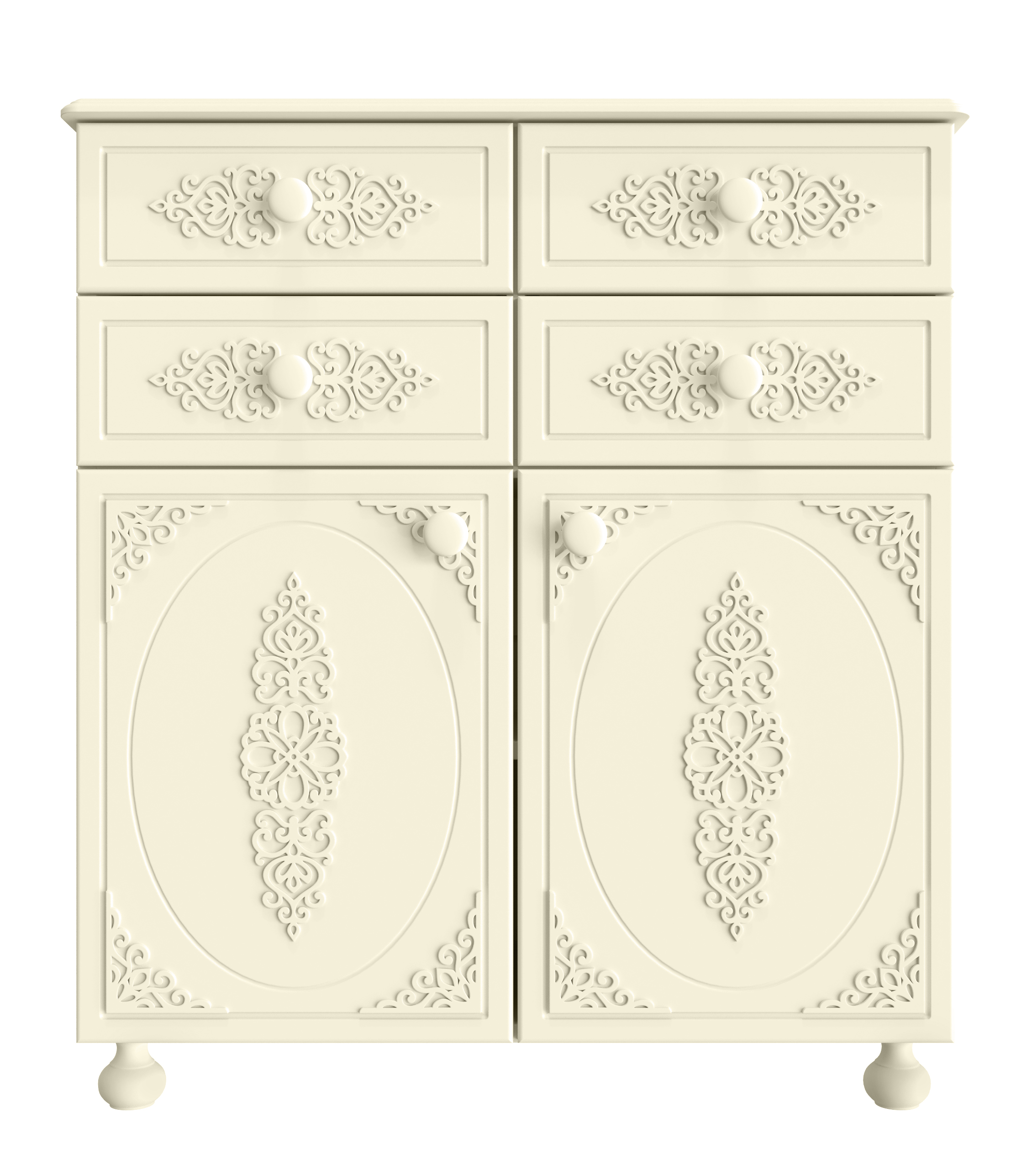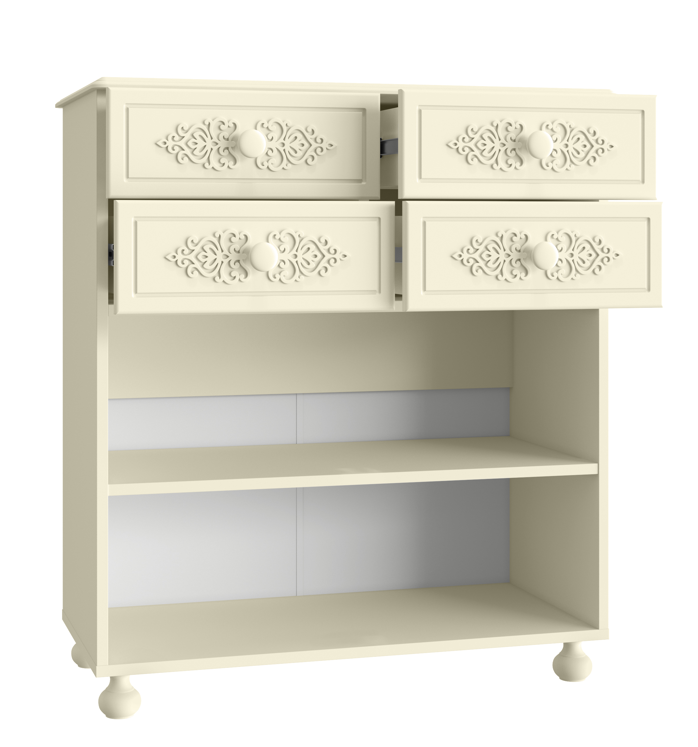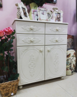 Тумба имеет четыре выдвижных ящика и две распахивающиеся дверцы. Ручки деревянные, гладкие и приятные на ощупь. Тумба установлена на четыре деревянные ножки.