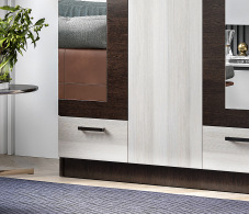 Распашной шкаф Адель разделен на две функциональные зоны: с одной стороны предусмотрена штанга для плечиков, а с другой — ряд полок для хранения вещей. Выдвижные ящики позволят аккуратно разместить белье и аксессуары. Фасады украшают два зеркала в полный рост.