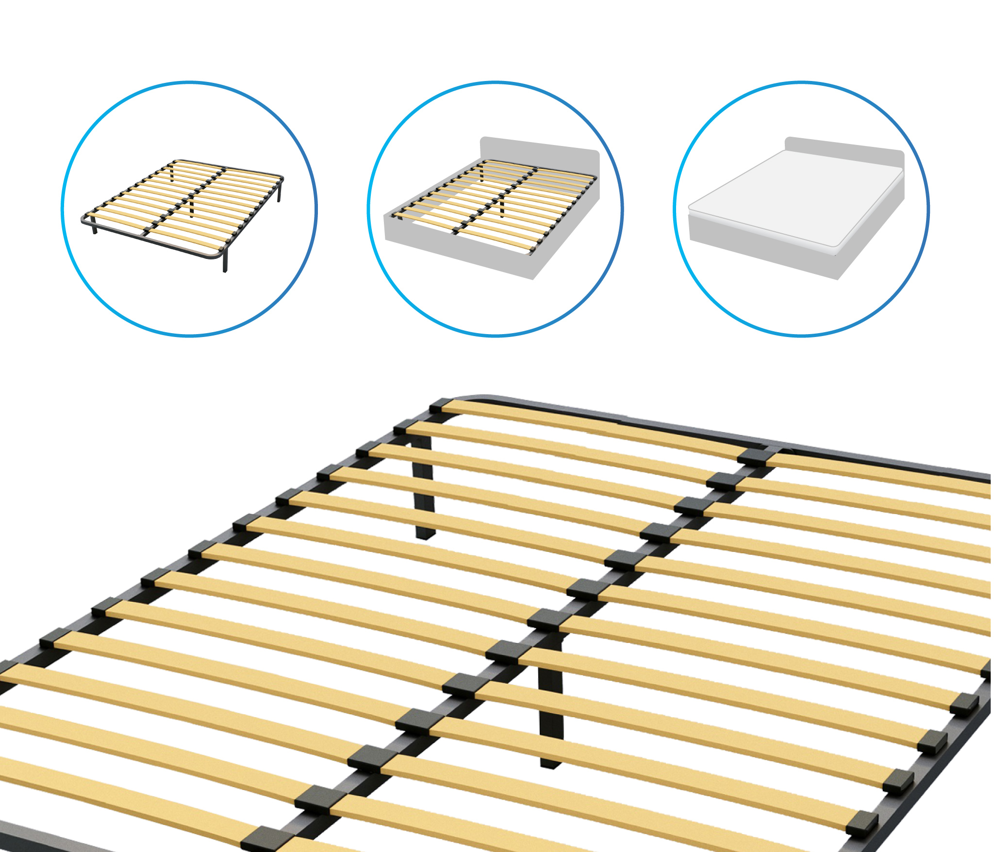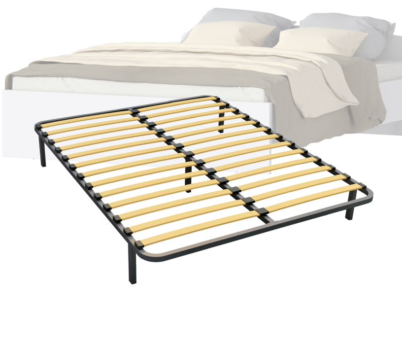 Разборное кроватное основание выполнено из металлической трубы квадратного сечения (30х30мм) и упругих гнуто-клееных берёзовых ламелей шириной 53 мм, толщиной 8 мм.