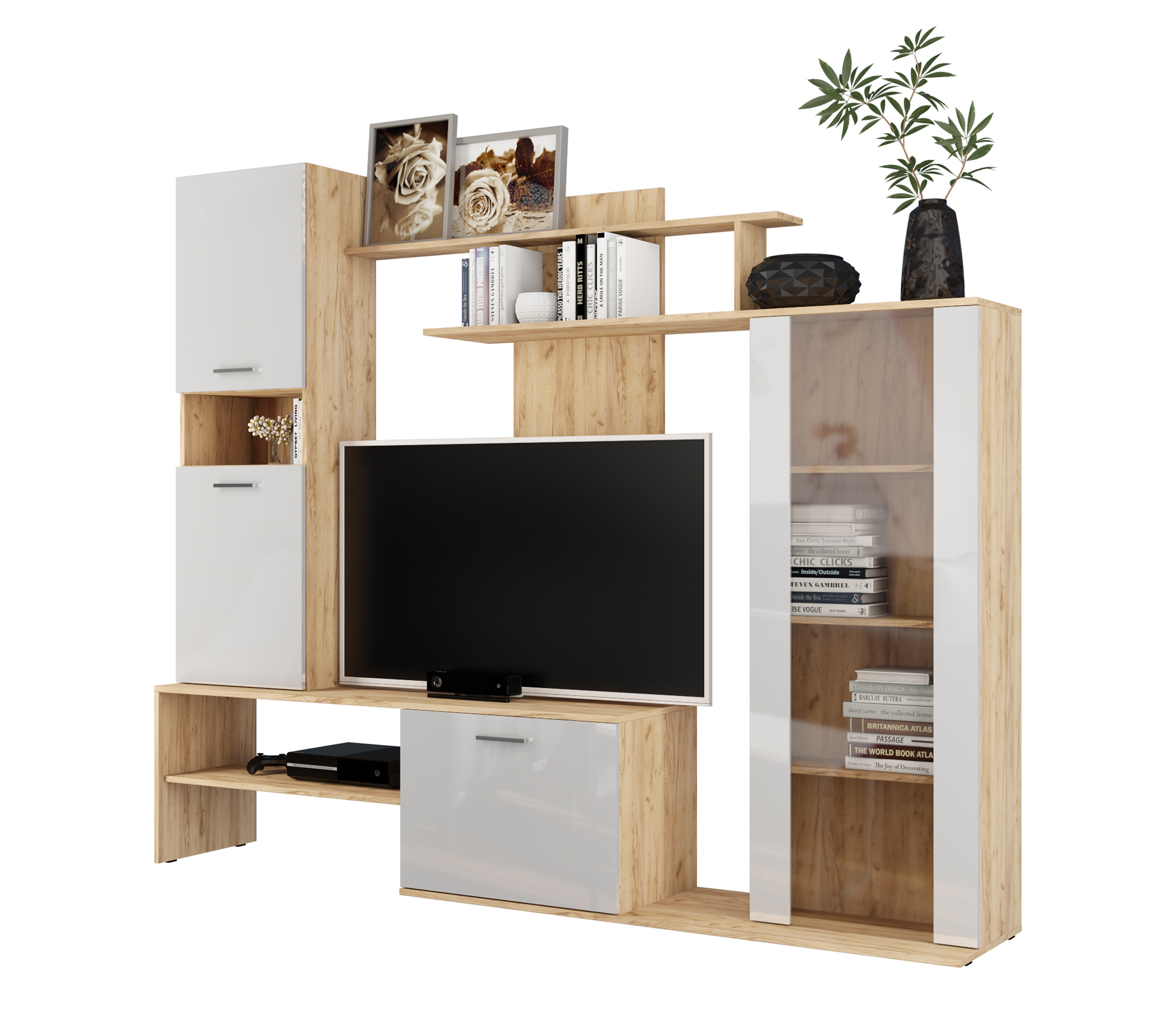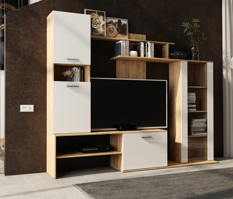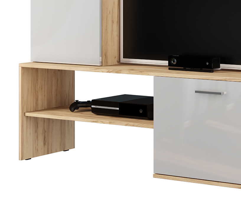 С ТВ тумбой , Стекло, глянцевые фасады, С полками