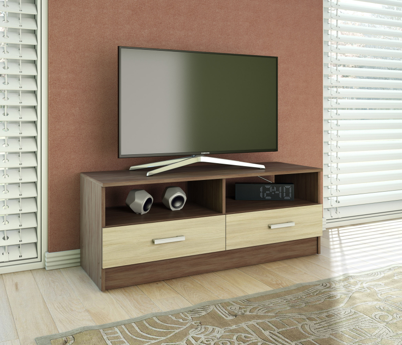 Простая, но практичная ТВ-тумба прекрасно подойдет для обустройства современного интерьера. Широкие полки и ящики позволят с удобством разместить технику и сопутствующие аксессуары.