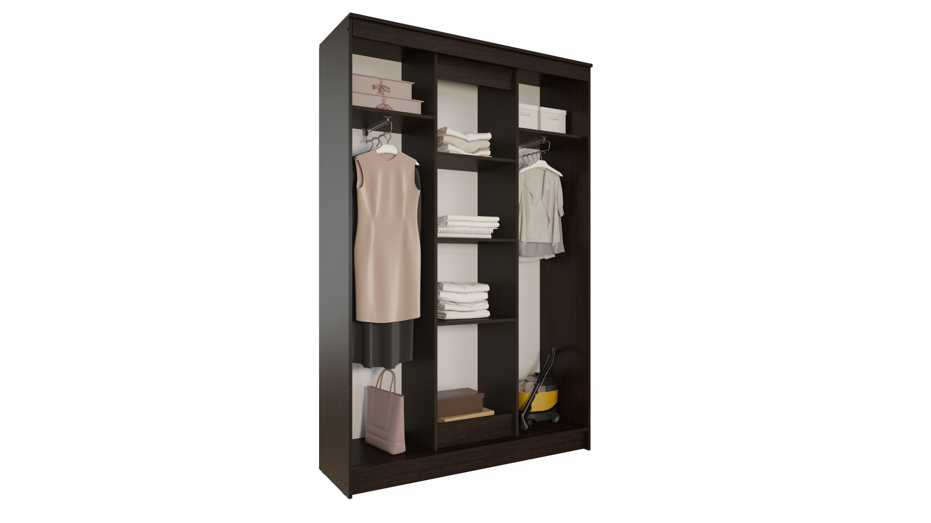 Шкаф-купе Агат обладает простым, но привлекательным стилем исполнения. Модель оснащена множеством полочек в центральном отделении и двумя евроштангами в боковых секциях.