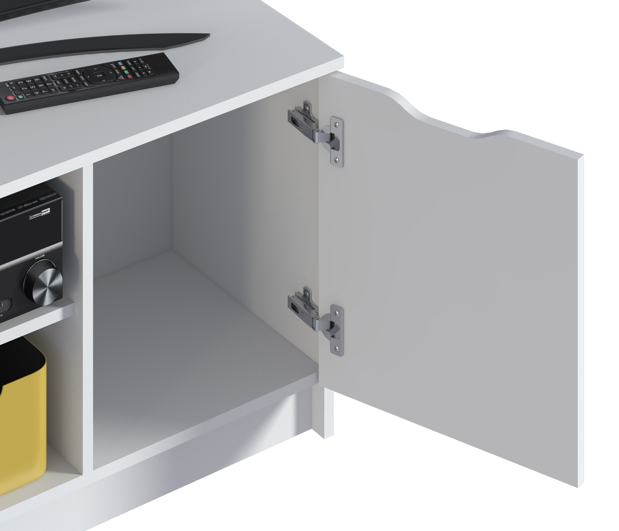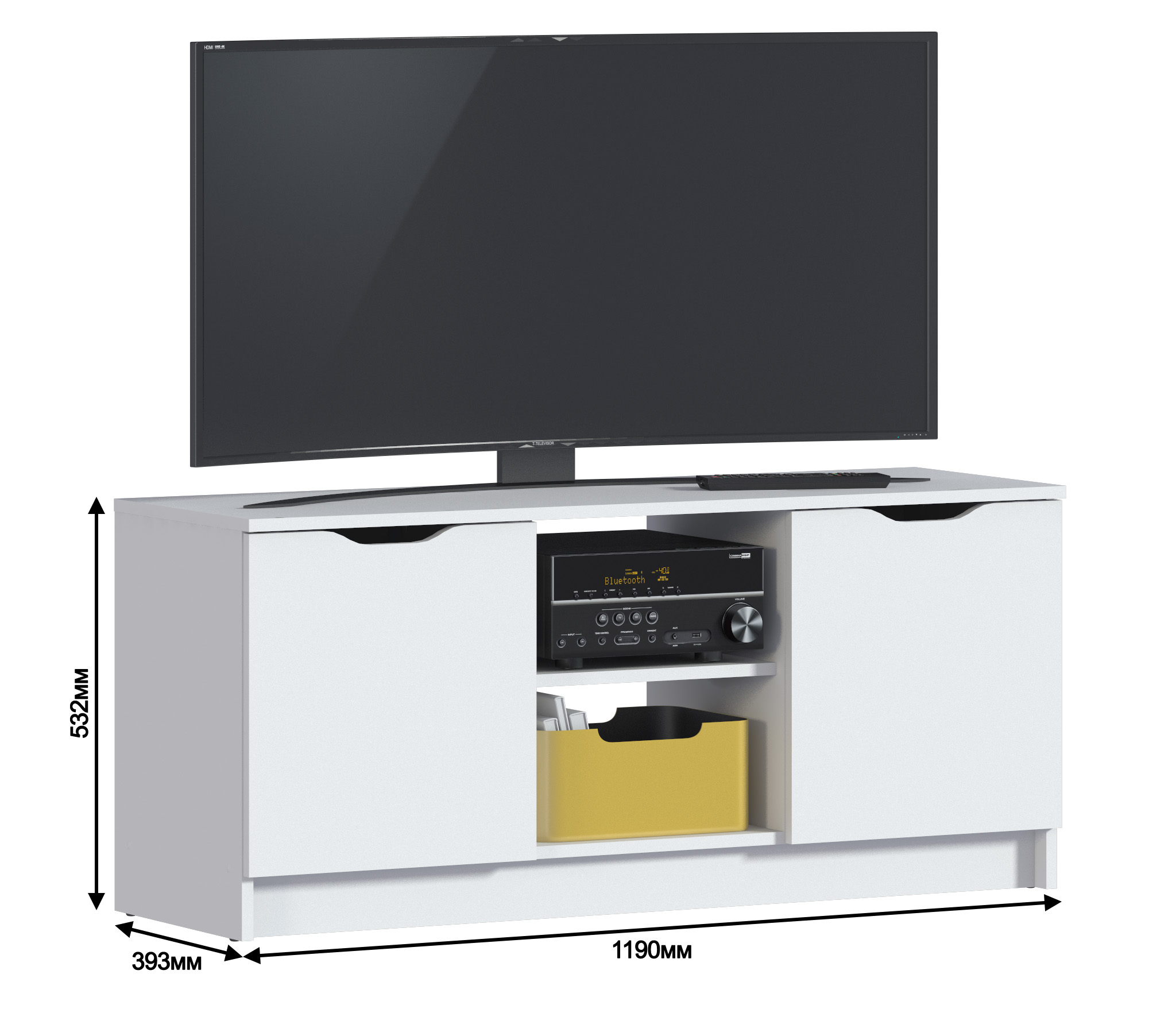 Габаритные размеры – ширина 119, высота 53 см и глубина 39 см. Вес тумбы 24,42 кг, что даёт возможность передвигать её по усмотрению. Визуально тумбу можно разделить на три отделения – открытое центральное с двумя полками для аудио или видео системы и два вместительных отделения с дверцами. Тумба выполнена в минималистичном дизайне из прочного современного материала ЛДСП.