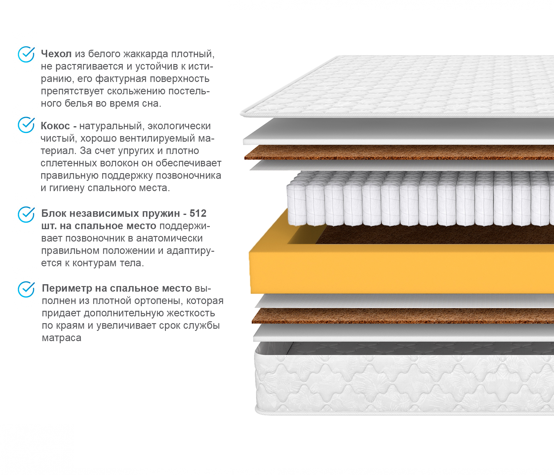 Кокос - натуральный, экологически чистый, хорошо вентилируемый материал. За счет упругих и плотно сплетенных волокон он обеспечивает правильную поддержку позвоночника и гигиену спального места.