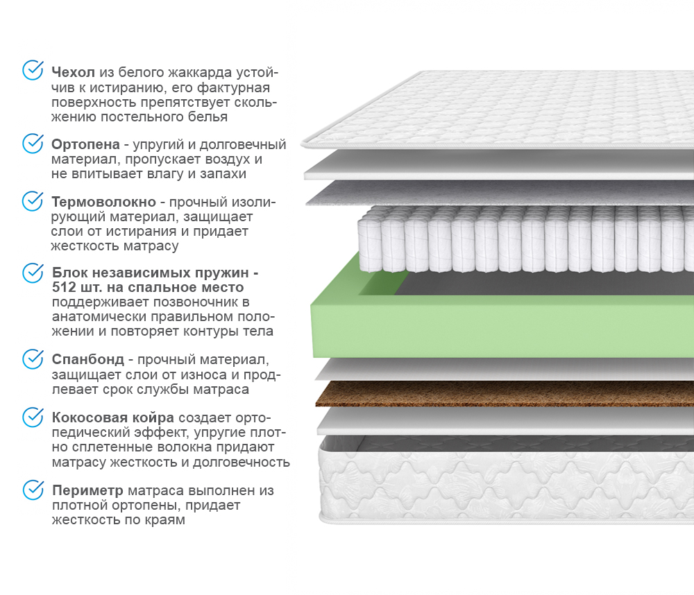 Ортопена в составе комфортного слоя принимает форму, идеально повторяющую контур тела, хорошо пропускает воздух и не впитывает влагу и запахи.