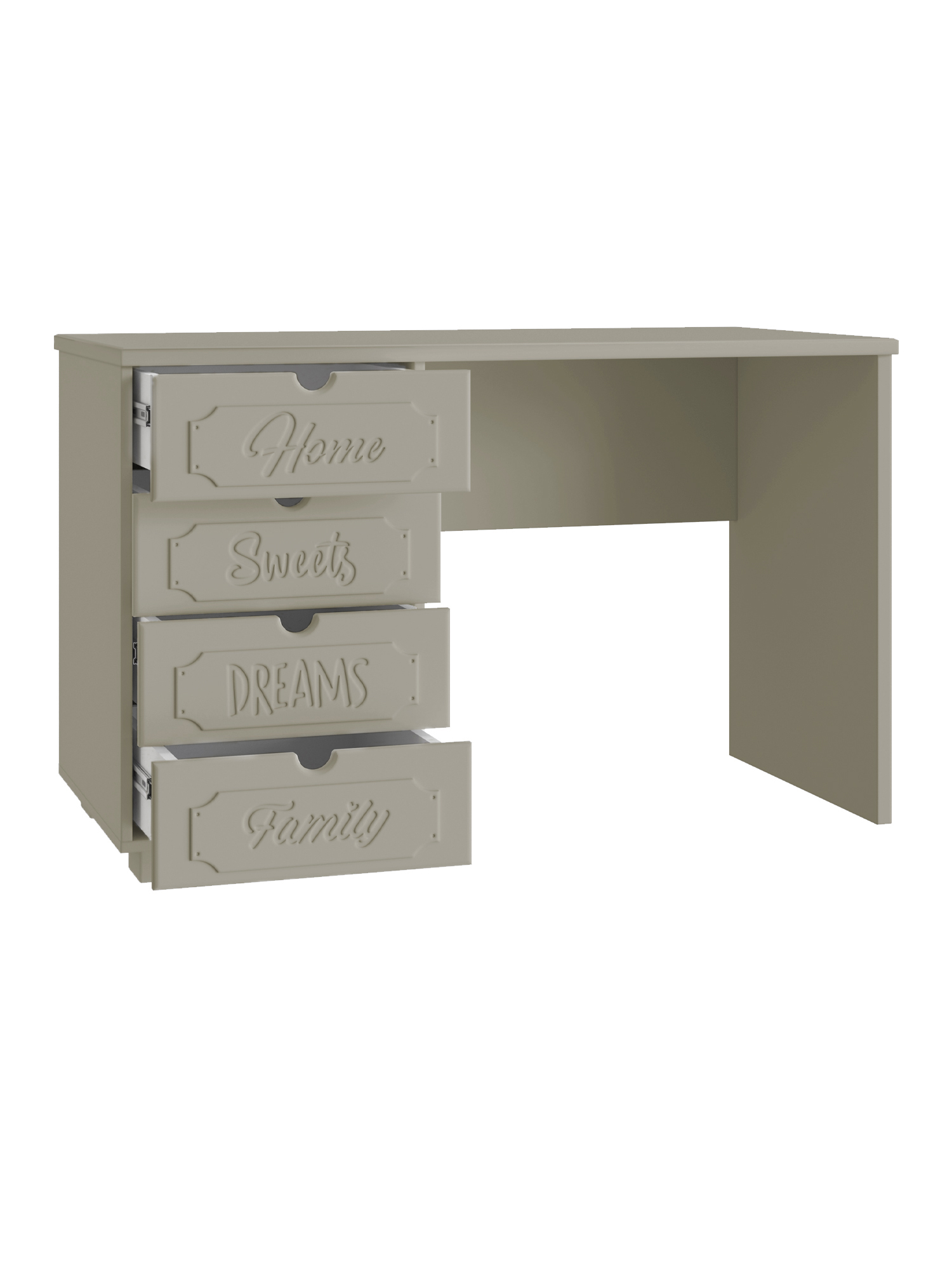 Система мебели "Дримстар" включает в себя отдельные самостоятельные модули, сочетающие в себе функциональность и уникальность дизайна. С базовым набором модулей легко оформить интерьер любого помещения. Все модули можно комбинировать между собой. Фасады украшены надписями, которые придают моделям оригинальный вид. Коллекция "Дримстар" поможет вам в оформлении стильного и современного интерьера. Столешница изготовлена из МДФ толщиной 25 мм. В ящиках используются телескопические направляющие полного выдвижения. Расположение ящиков только с правой стороны.