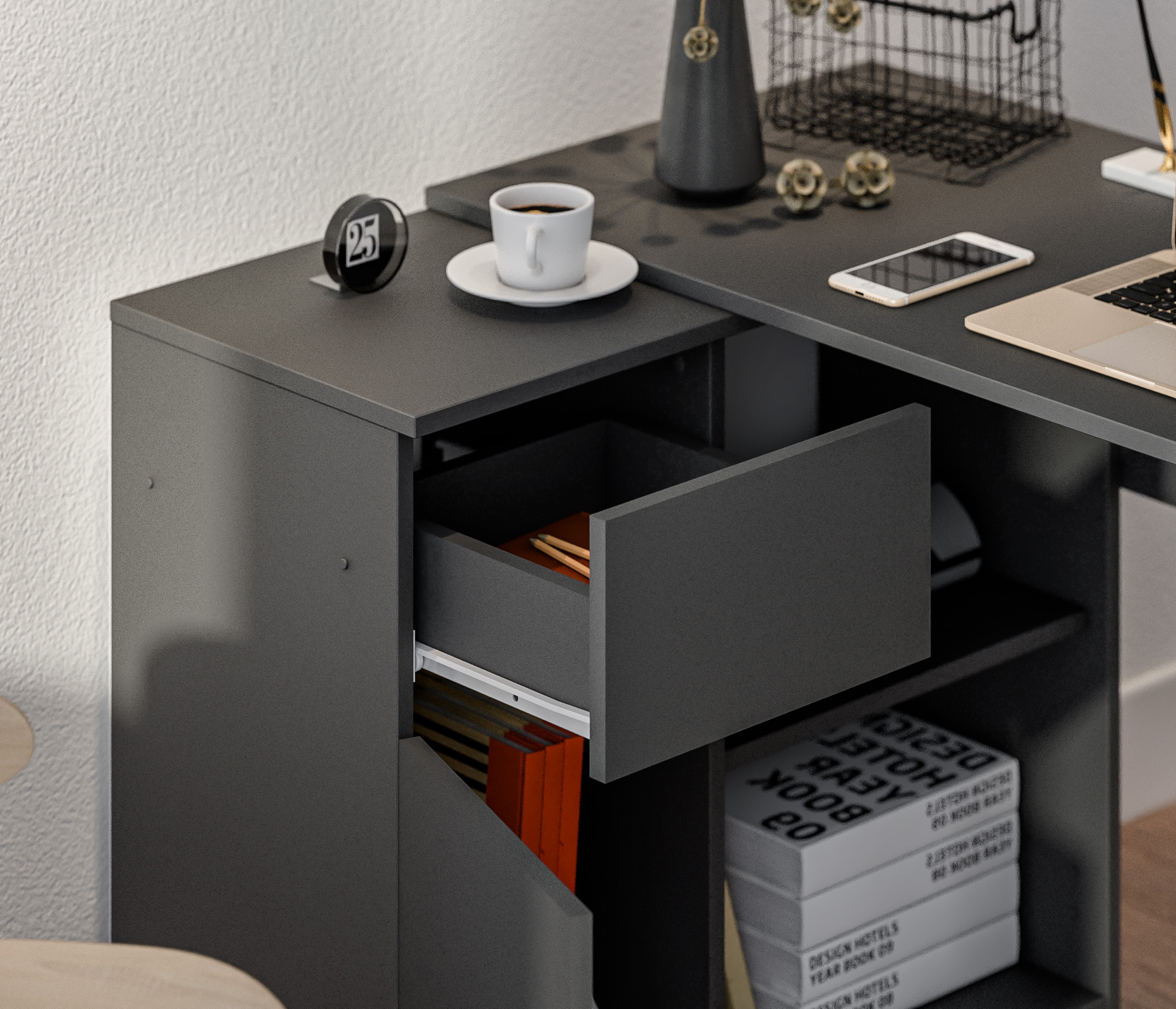 Габаритные размеры – ширина 119 см, высота 75 см и глубина 80 см. Под рабочей поверхностью расположена тумба с открытыми вместительными полками, а также выдвижной ящик и закрытое отделение с отдельной дверцей. Стол произведен из современного экологичного ЛДСП. Возможен как левый, так и правый вариант сборки.