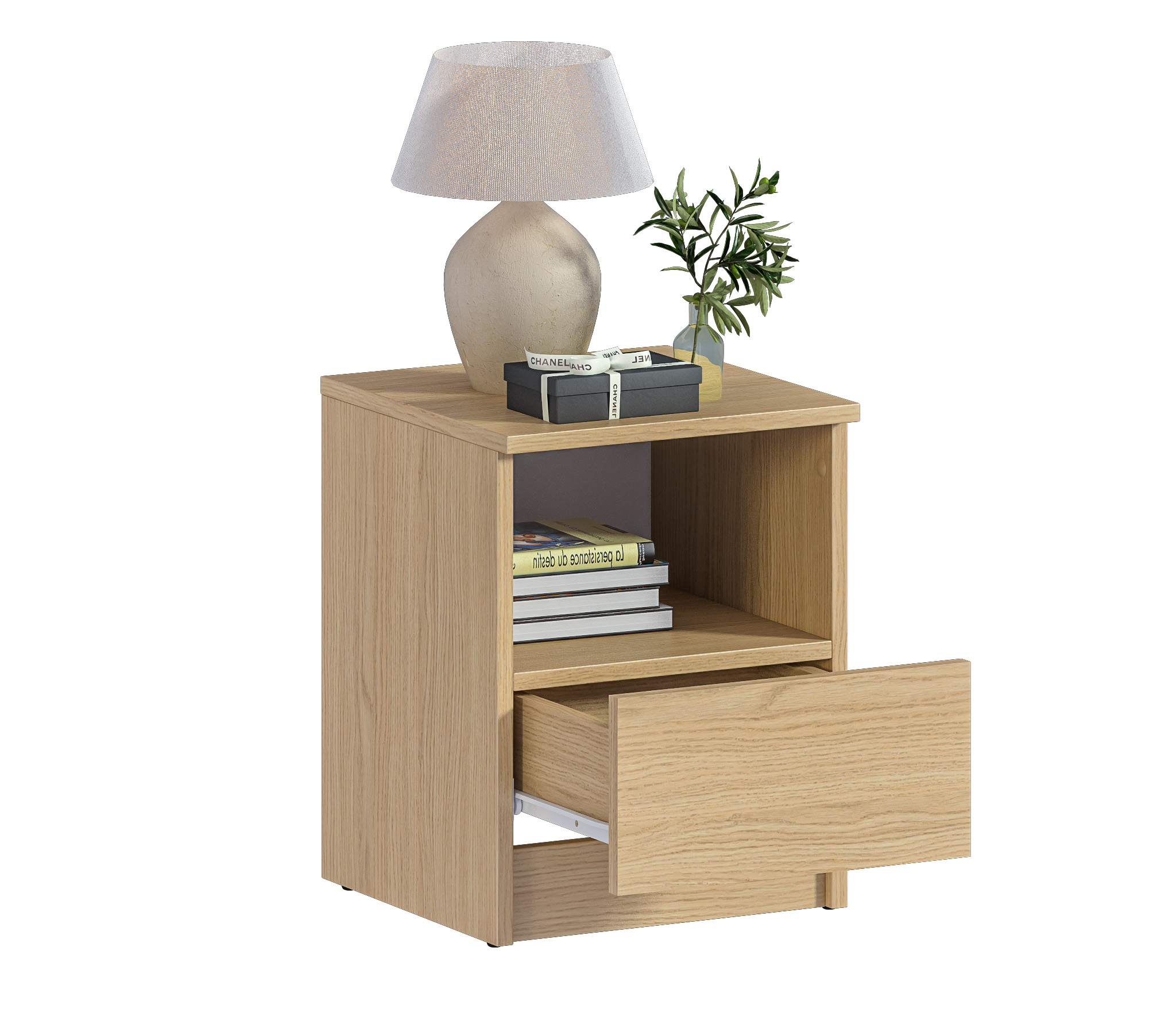При компактных габаритных размерах – ширина 35 см, высота 44,4см и глубина 35,3 см, тумба довольно вместительная. Под столешницей расположены открытая полка и выдвижной ящик, куда можно положить планшет или книгу.