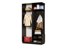 Дверь делит шкаф на 2 равные части: отделение для верхней одежды и отделение с полками и крючками.