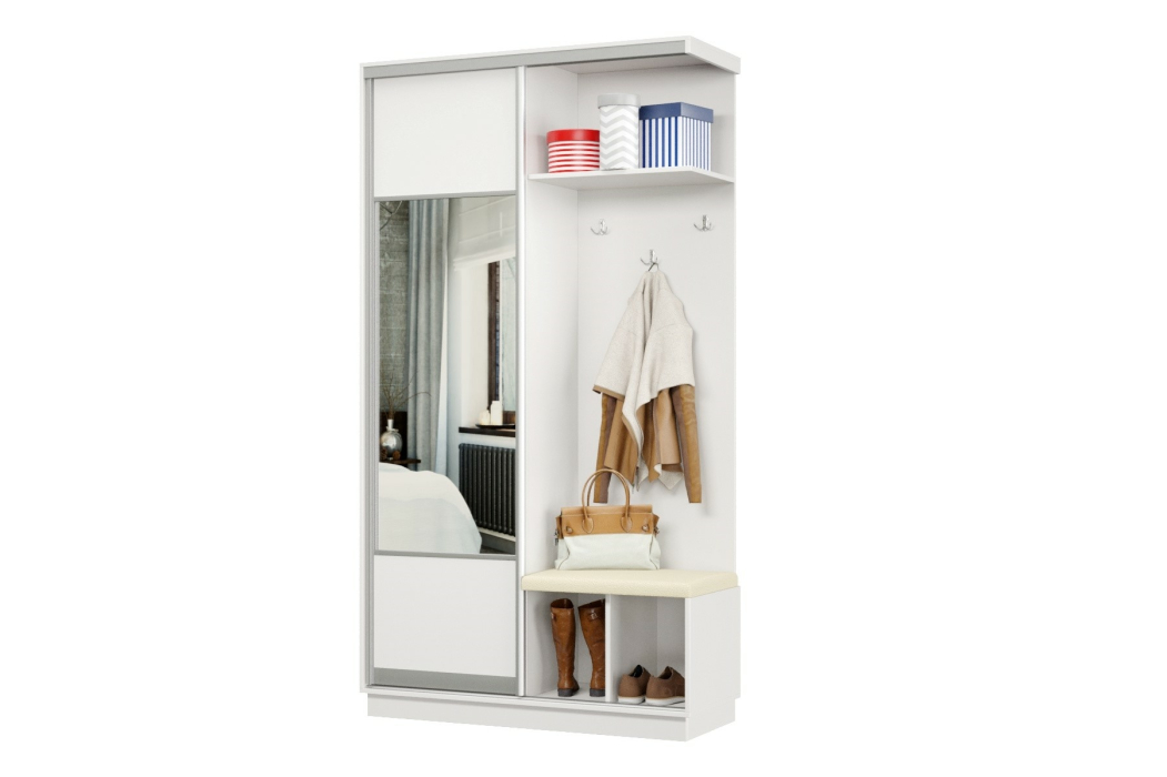 В прихожей используется одна дверь, которая перемещается по однополосному треку вправо или влево, закрывая или открывая каждую из двух частей шкафа.