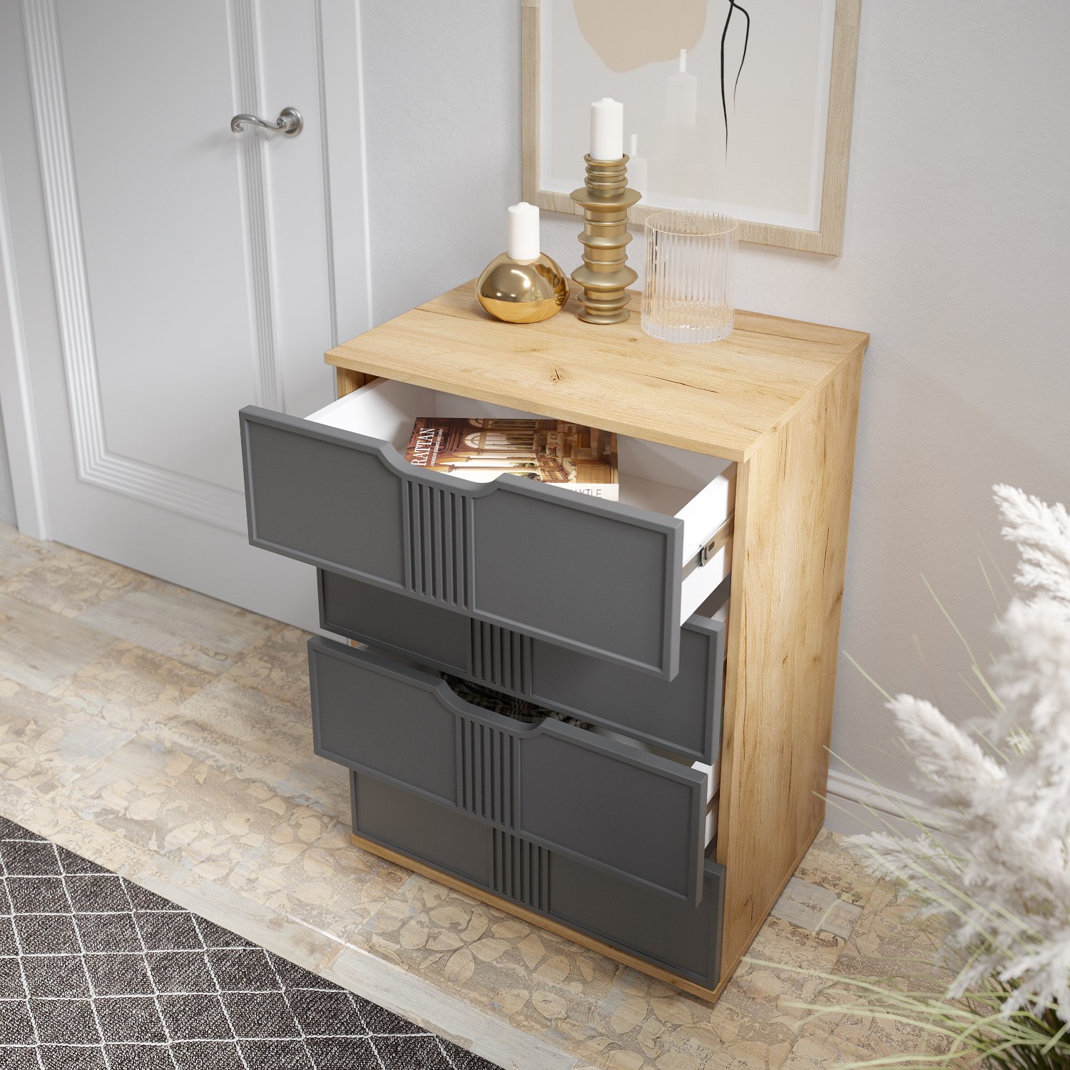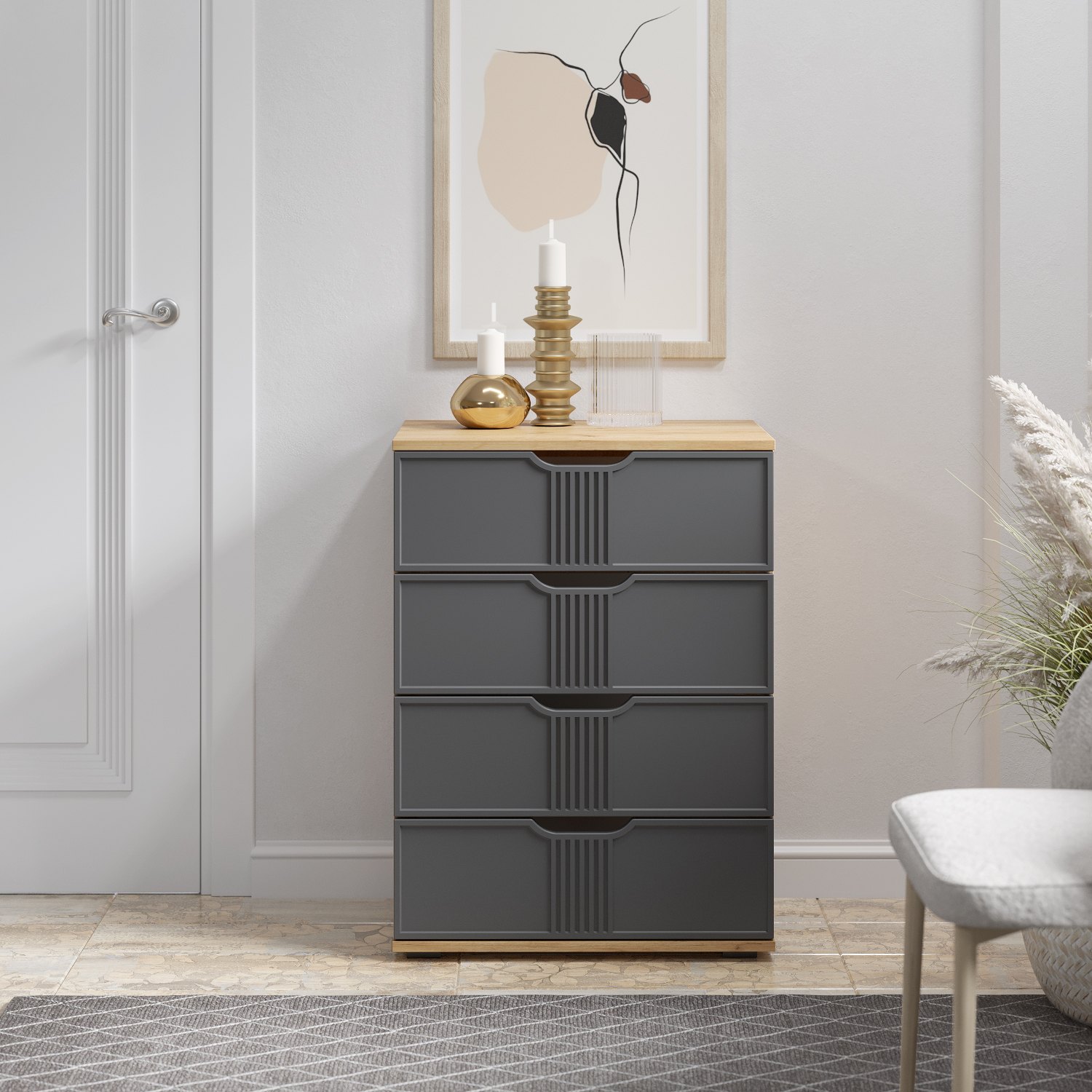 Комод Эмилия ЭЛ-19 изготовлен из ЛДСП 16 мм, фасады МДФ. Свес крышки в 30 мм обеспечит прилегание к стене с любым плинтусом. Фурнитура: телескопические направляющие полного выдвижения без доводчиков. Важная информация. Мебель доставляется в разобранном виде, в упаковках.