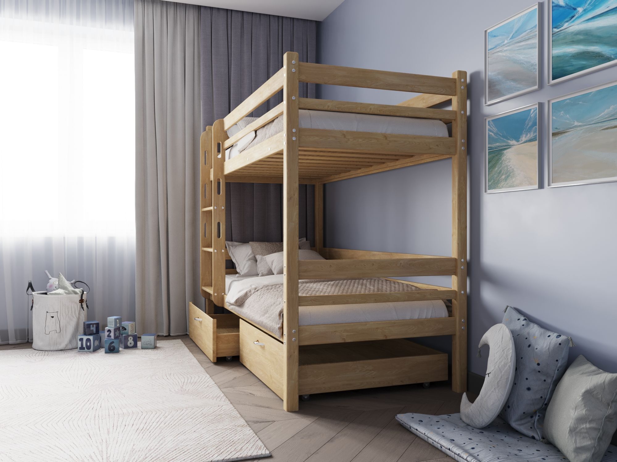 устанавливаемым на втором ярусе, фурнитурой и шестигранным ключом, необходимым для проведения сборки/разборки кровати. В дополнение можно приобрести эргономичные выкатные ящики для хранения игрушек, белья и других вещей.
