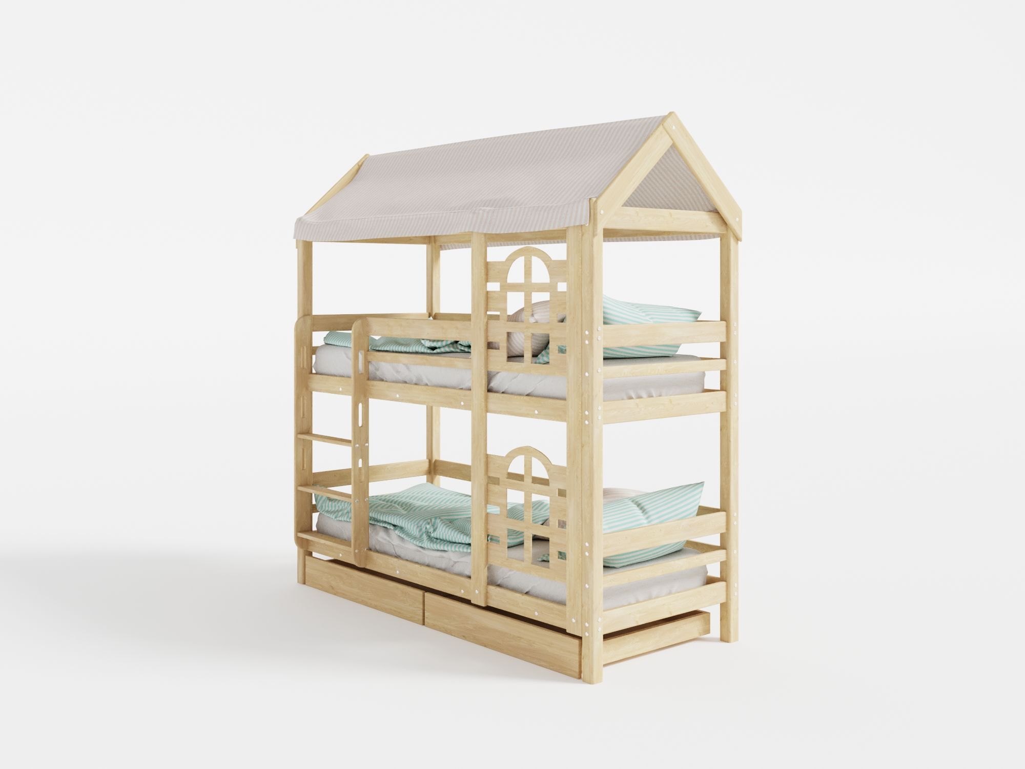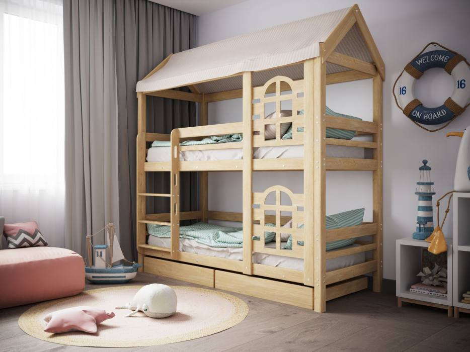 Модель двухъярусной кровати домика «Baby Lux» производится из массива натурального дерева без какого либо использования пропиток, лаков и красок, поэтому имеет высокую экологическую безопасность.