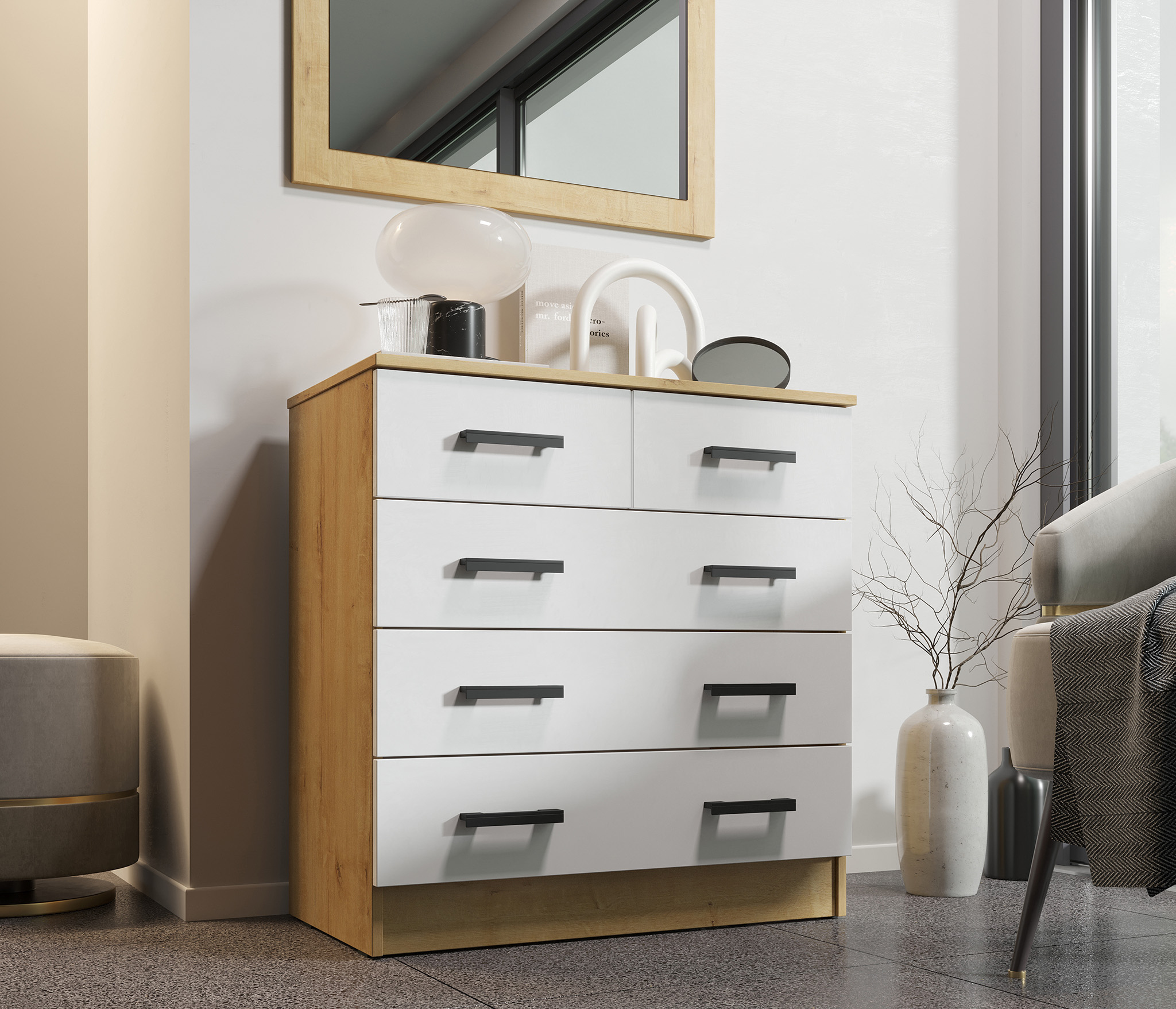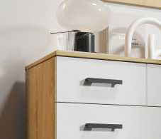 Нормальный комод за свои деньги. Выглядит достаточно прилично и современно. Все дырочки, шурупчики-на месте, ножки хрупкие. Главное аккуратно собирать и прикручивать ручки, чтобы не повредить верхний белый слой сколами. Тот, что под дерево сделан качественнее. Белый цвет не глянцевый. Единственный минус- проветривался от хим запаха лдсп где-то неделю.