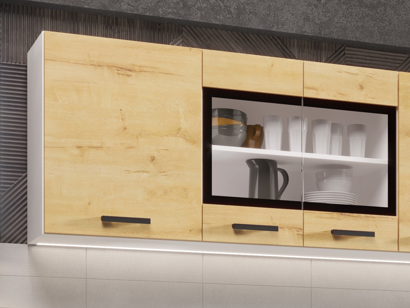 два верхних шкафа: первый шкаф - общая ширина 1200мм (500мм , 700мм со стеклом). Внимание! Это единый элемент, разъединить шкафы невозможно! Второй шкаф: на 600мм. Высота 626мм. Глубина 270 мм.