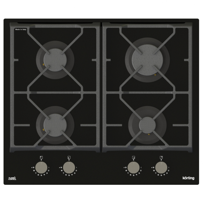 Газовая варочная панель из закаленного стекла шириной 60 см, 4 высокоэффективные конфорки, технология точной регулировки мощности пламени в 9-ти положениях Flame Control, автоматический электроподжиг, газ-контроль каждой конфорки, переднее расположение поворотных регуляторов, металлические регуляторы, цельные чугунные решетки, цвет - черное стекло.