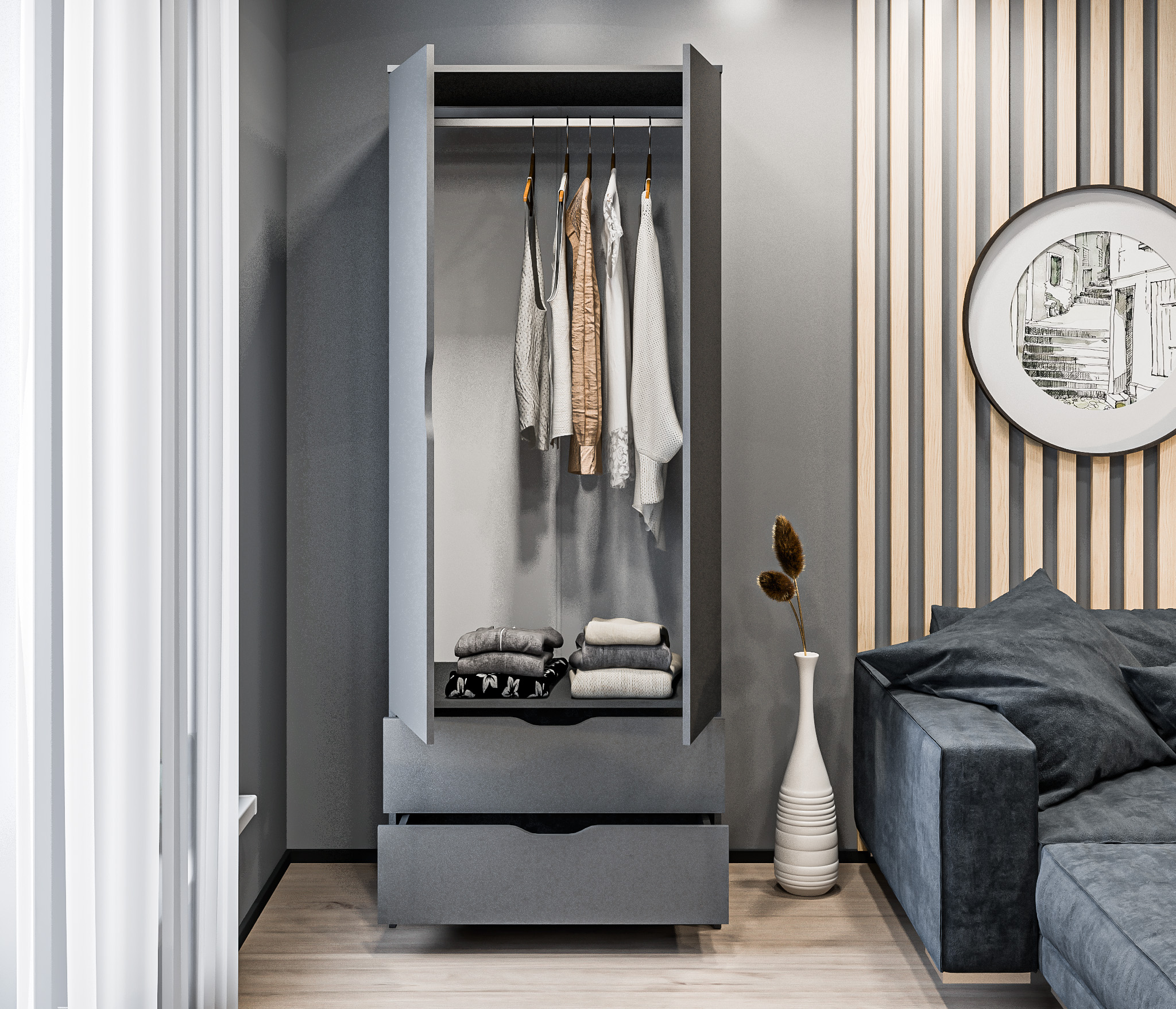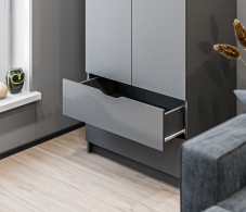 Внутри шкафа вы найдете два удобных ящика, которые помогут вам организовать мелкие предметы и аксессуары. Ящики легко выдвигаются и закрываются, обеспечивая удобный доступ к вашим вещам.