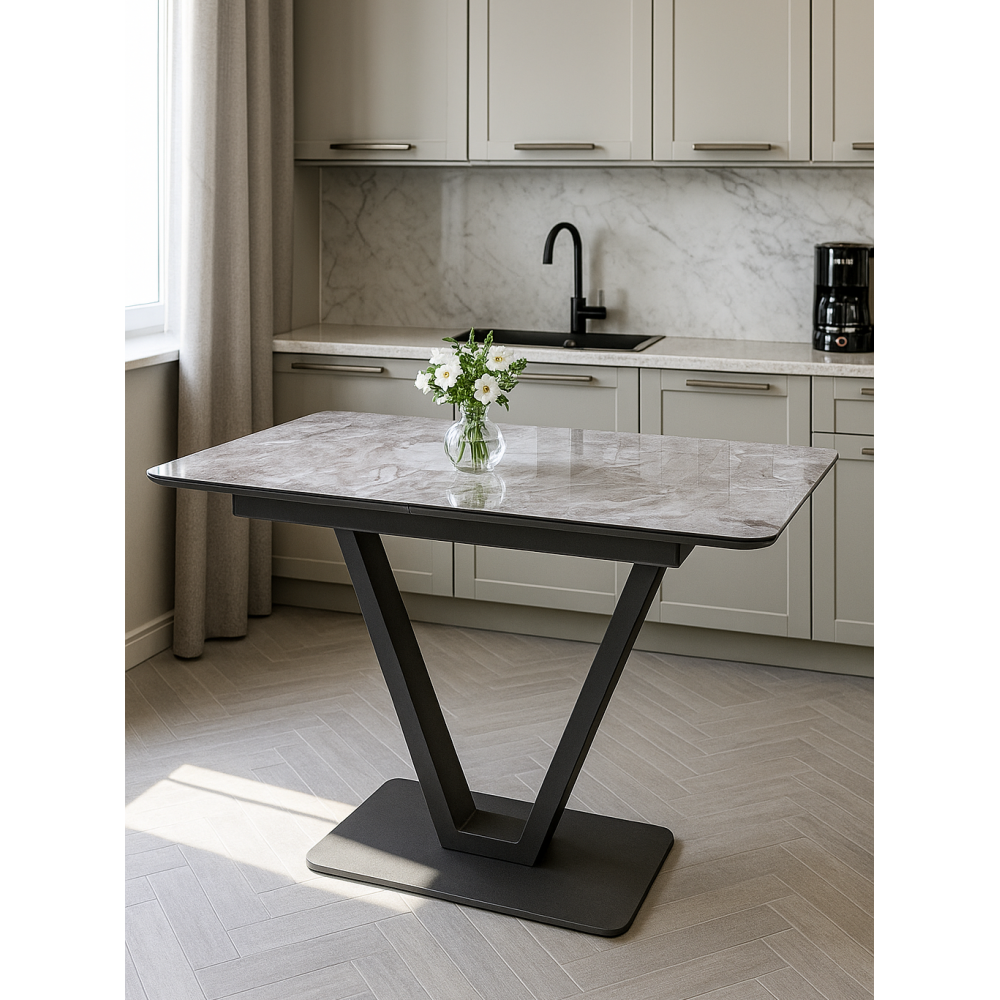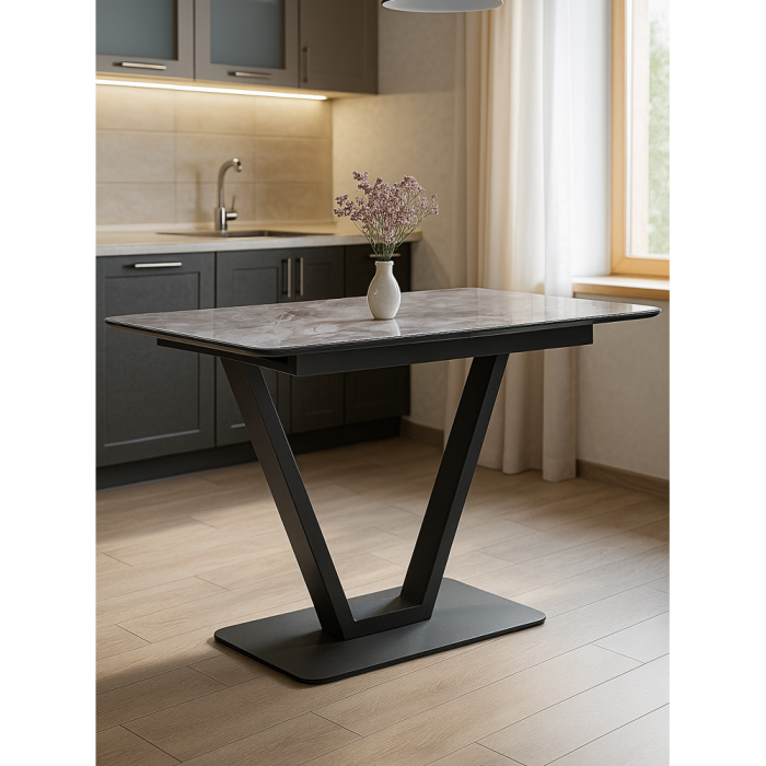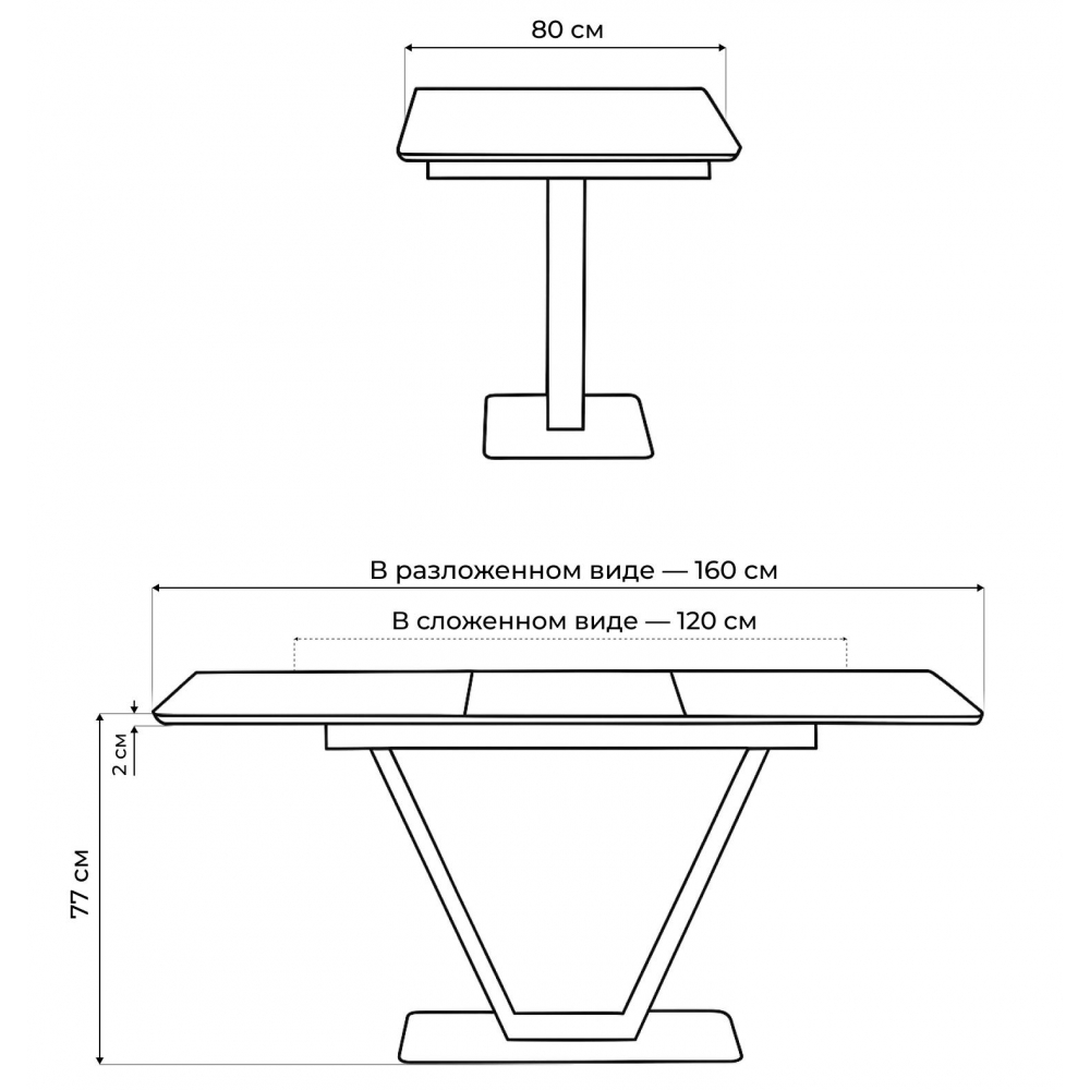 Материал каркаса - Металл; Материал ножек - Металл; Материал столешницы - Стекло; Цвет каркаса - Черный; Цвет ножек - Черный; Цвет подстолья - Черный; Ширина - 80; Высота - 77; Длина стола в разложенном виде - 160; Длина - 120.