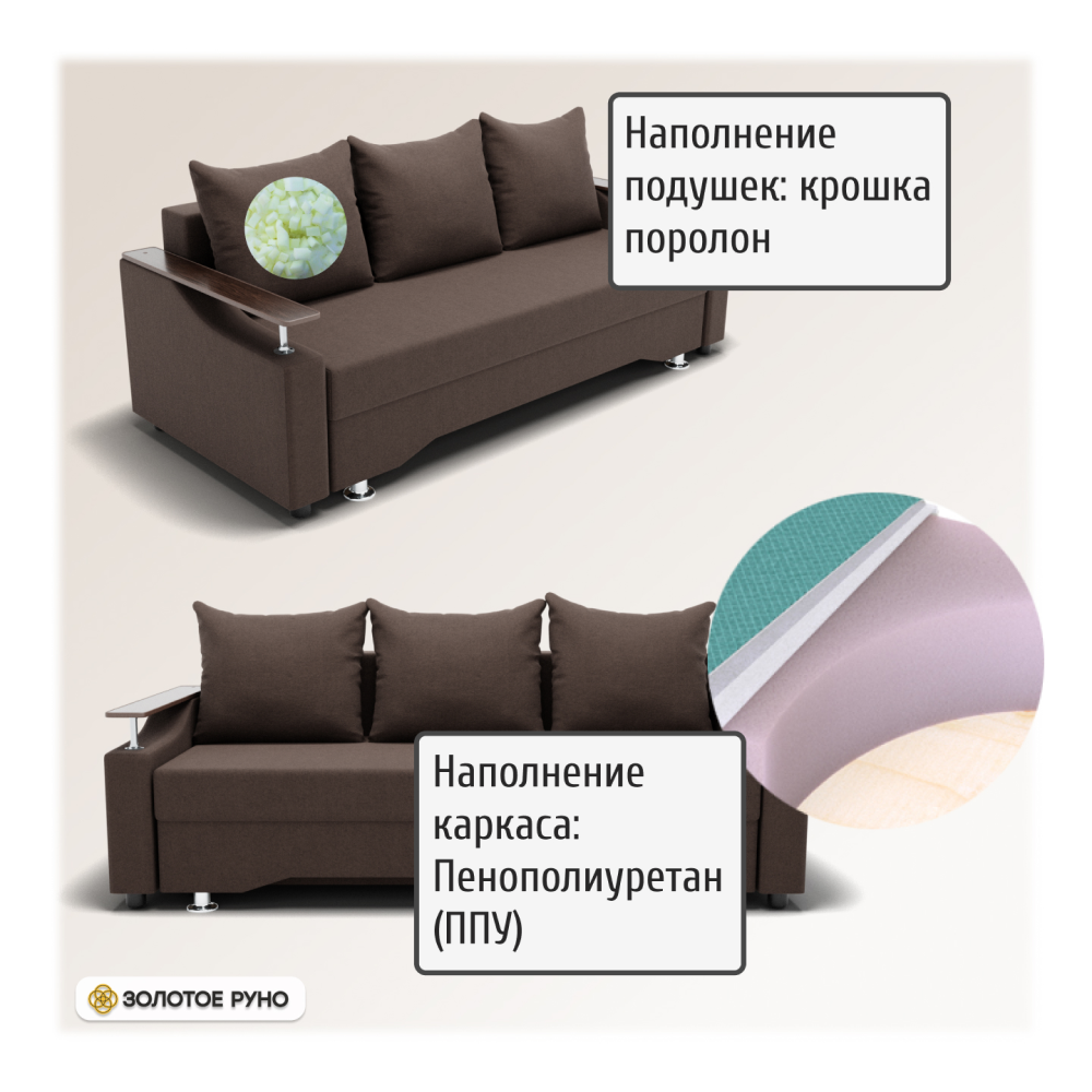 Достоинства: ровное спальное место, лёгкость процесса трансформации дивана, ёмкий бельевой ящик, прочность механизма, долговечность конструкции.