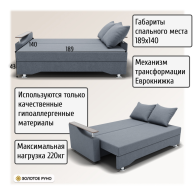 Достоинства: ровное спальное место, лёгкость процесса трансформации дивана, ёмкий бельевой ящик, прочность механизма, долговечность конструкции.