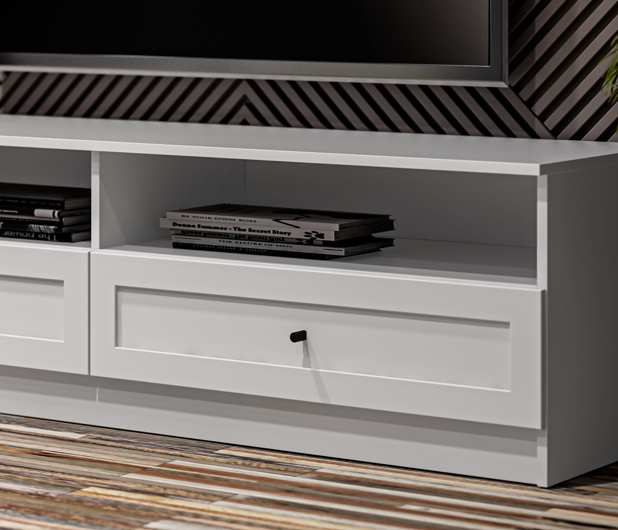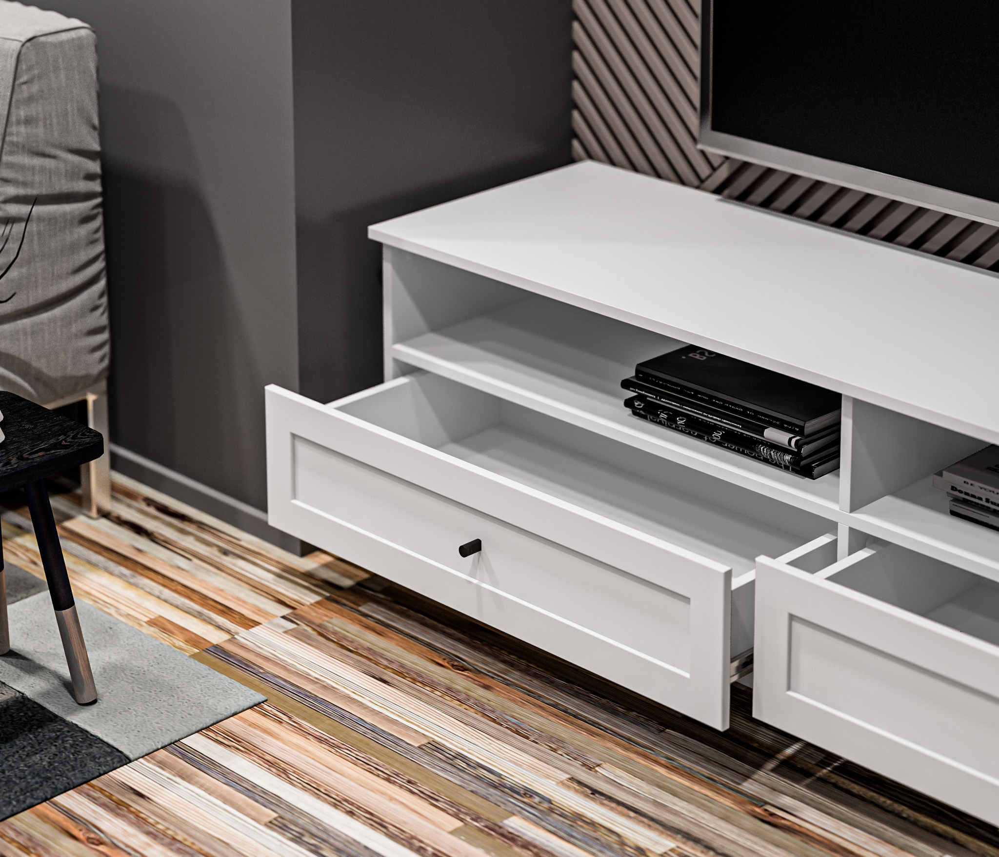 Продуманные детали делают использование тумбы максимально удобным: шариковые направляющие обеспечивают плавное выдвижение ящика.
