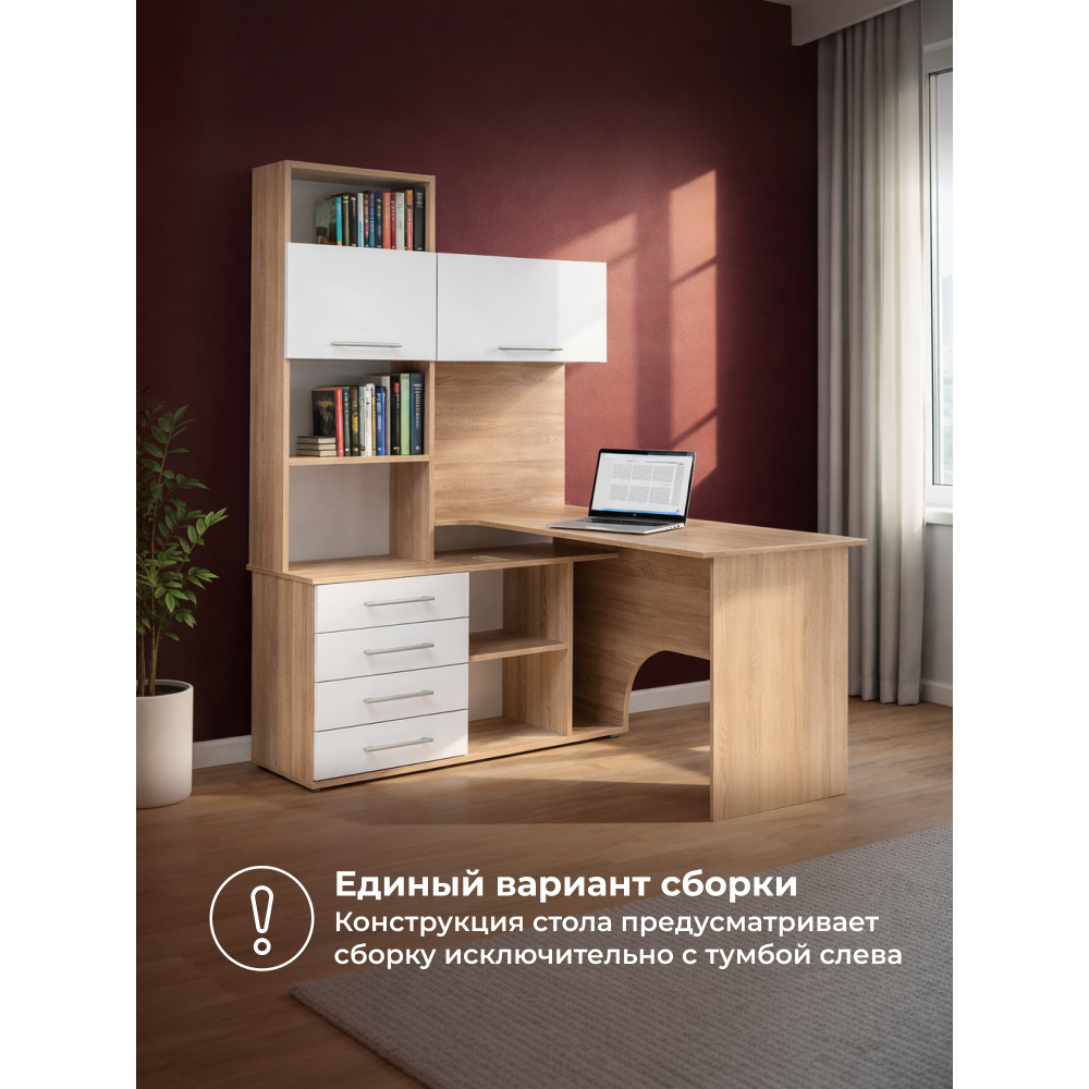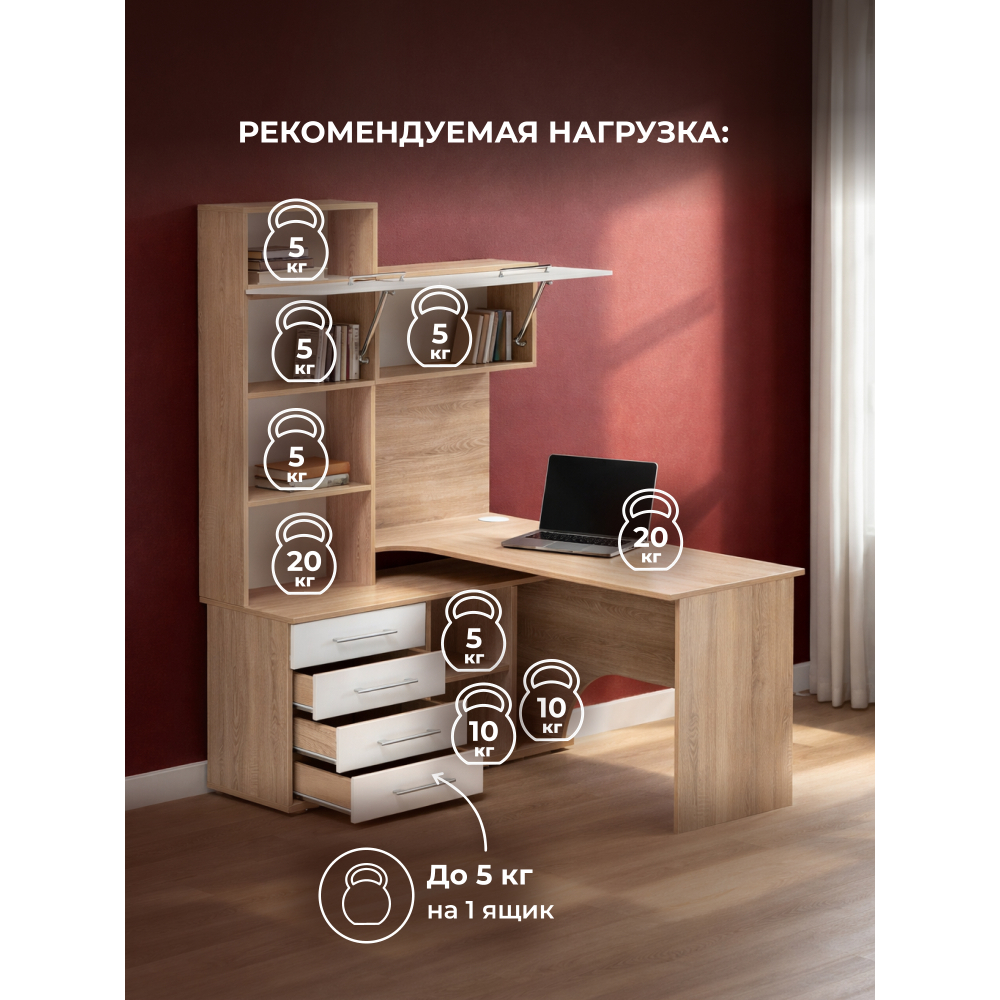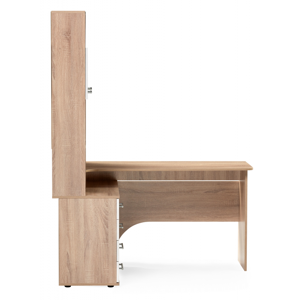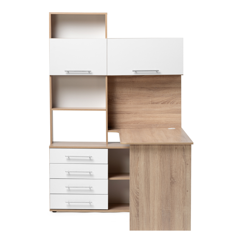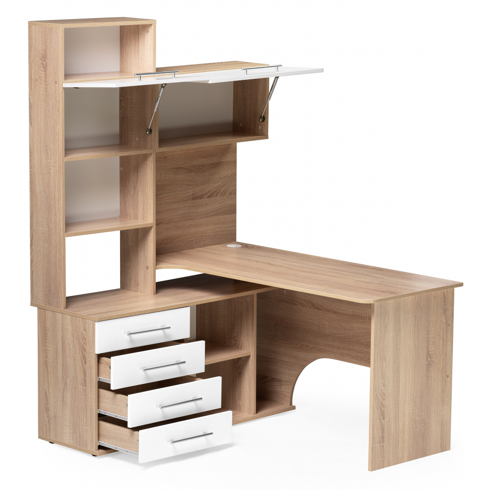 Стол КСТ-14Л левый дуб сонома / белый; ЛДСП. Толщина ЛДСП - 16мм. 4 ящика частичного выдвижения на роликовых направляющих. Имеется отверстие для кабелей. Дверцы с подъёмными газлифтами