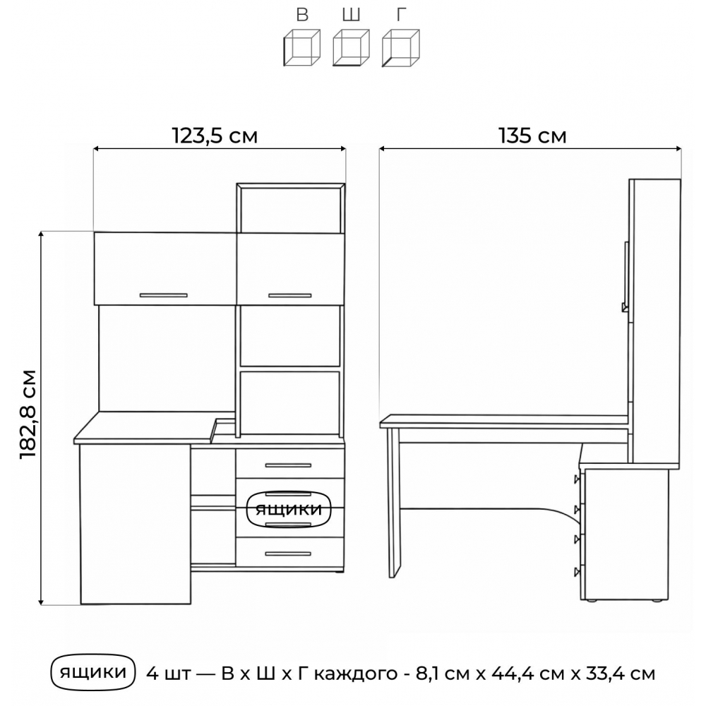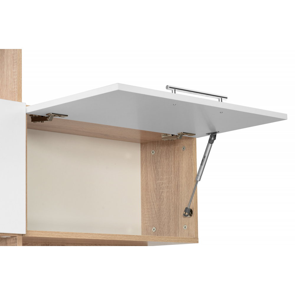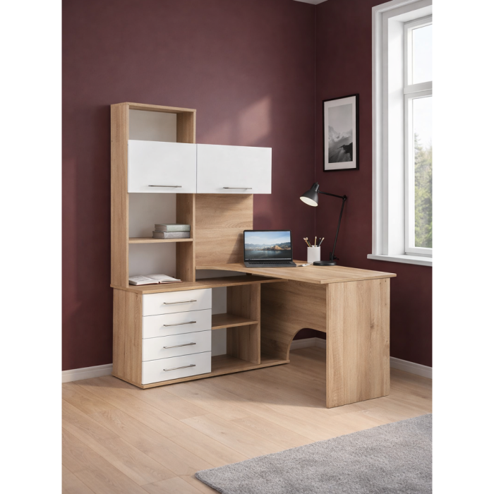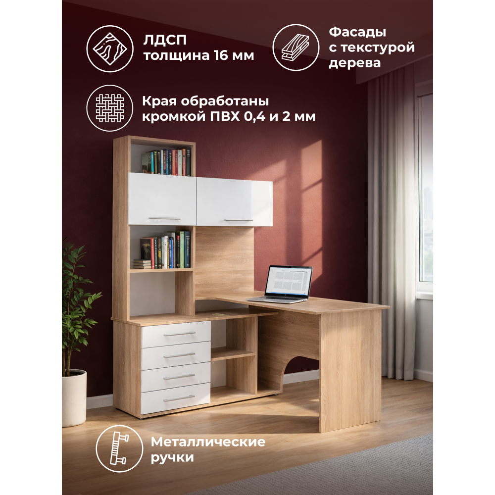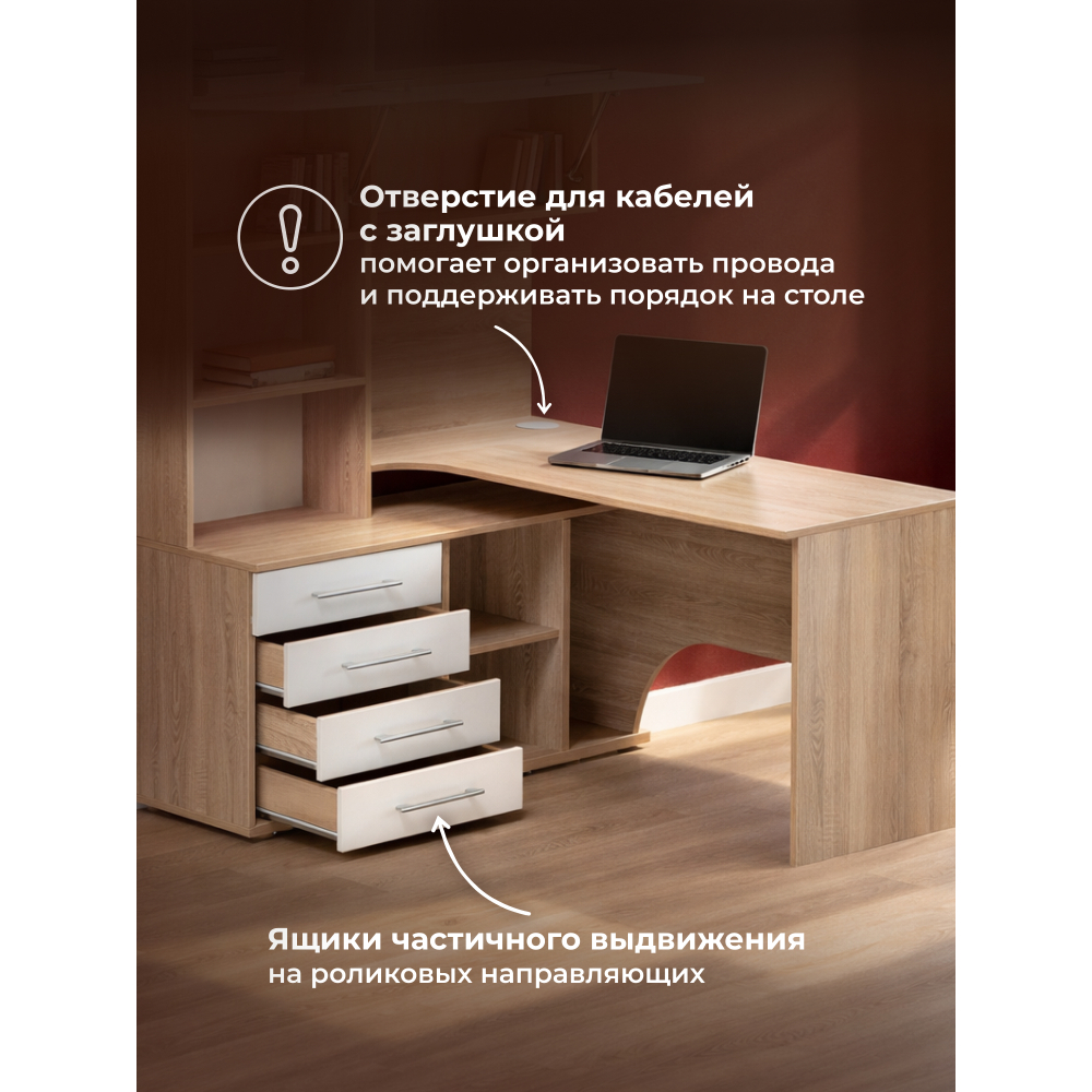 Стол КСТ-14Л левый дуб сонома / белый; ЛДСП. Толщина ЛДСП - 16мм. 4 ящика частичного выдвижения на роликовых направляющих. Имеется отверстие для кабелей. Дверцы с подъёмными газлифтами