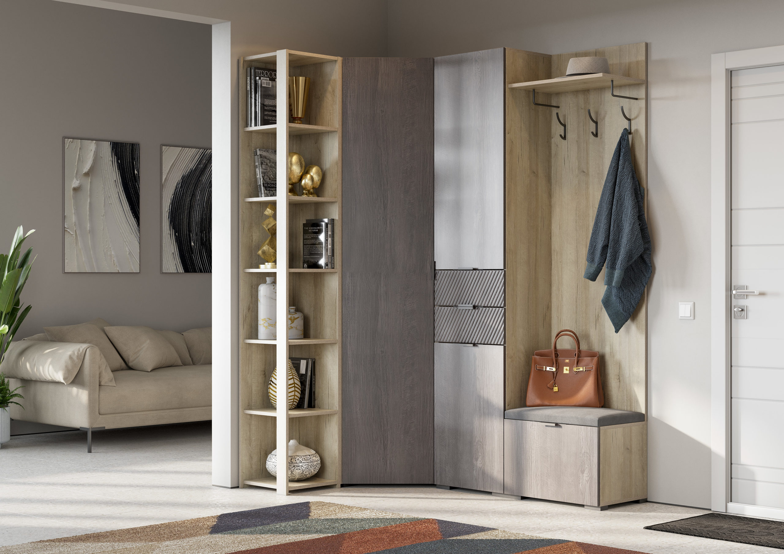 Новые современные цвета: черный ясень — это глубокий серый, легкий и одновременно динамичный цвет в сочетании с санторини белым — цвет с древесными линиями, создающими гармоничный контраст, наполняя пространство воздухом и природной энергией. Визуальная легкость, эстетика графики, элегантная окантовка с четкими формами, баланс теплых и холодных оттенков легли в основу дизайна новых модулей.