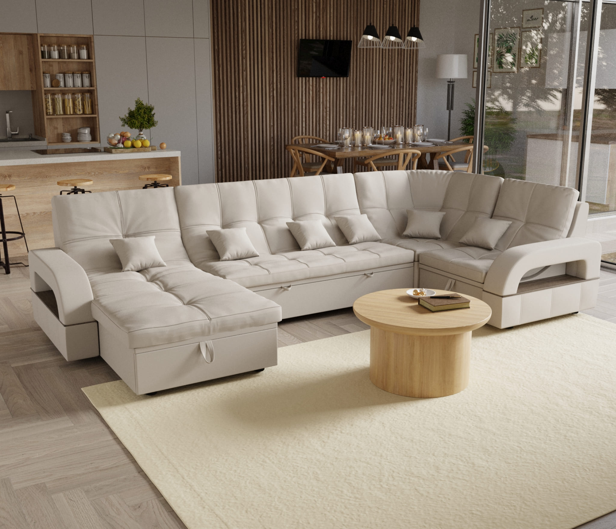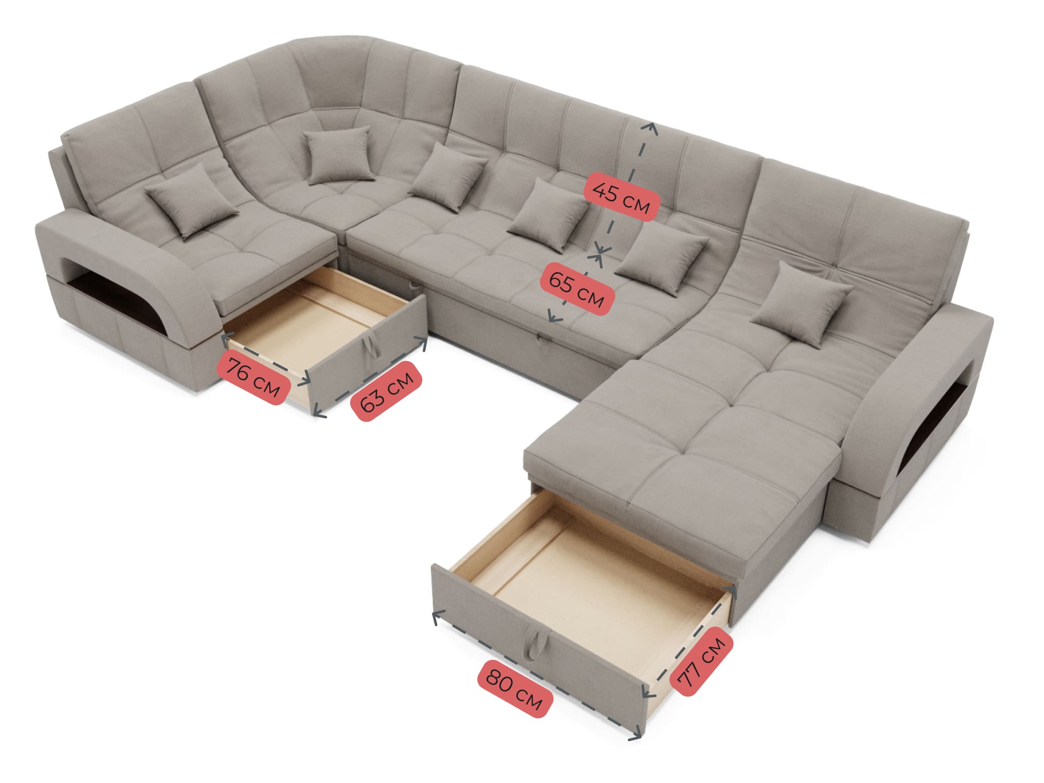 Подушки 6шт в комплекте. В чужих отзывах читала, что сзади ткань другая, но в нашем диване везде ткань одинаковая- его можно поставить посередине комнаты.