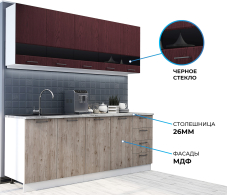 Кухонный гарнитур Астра длиной 2 метра подойдёт как для малогабаритной кухни, дачи, так и для небольшой кухни-гостиной. Кухня выполнена в стиле модерн и органично впишется в современный интерьер. Верхние фасады в цвете насыщенного бордо символизируют власть и силу, целеустремленность и уверенность. Нижние фасады с текстурой благородного дуба дополнят смелую кухню брутальностью. Распашные шкафы и выдвижные ящики вместят всю необходимую посуду, кухонную утварь и продукты. С рабочим пространством 1200*600 мм вы почувствуете себя настоящим шеф-поваром.