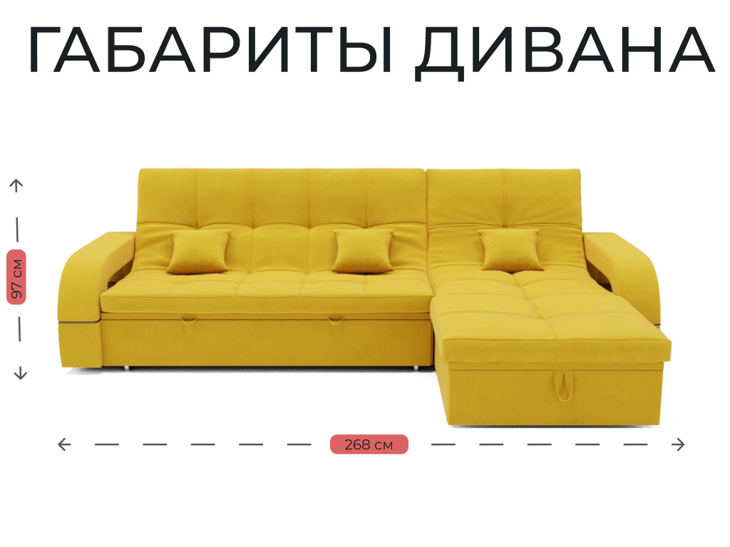 Он имеет высоту 97 см, ширину 268 см и глубину 175 см. Диван обладает универсальным расположением угла, что позволяет его использовать в любом помещении.